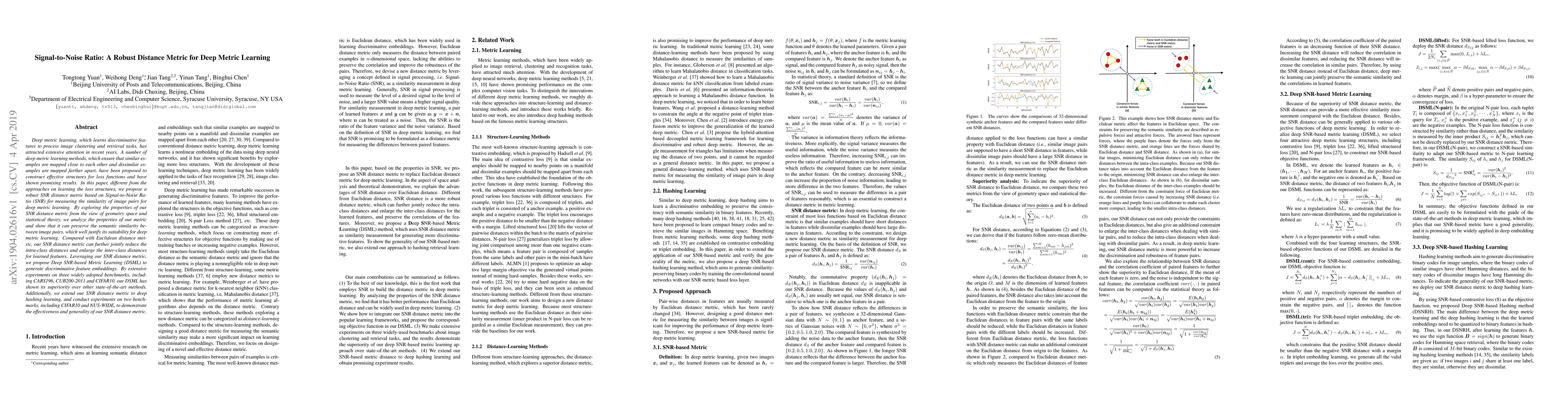 This paper proposes a robust Signal-to-Noise Ratio (SNR) distance metric for deep metric learning, which aims to enhance feature discrimination by reducing intra-class distances and increasing inter-class distances. The SNR distance metric is shown to outperform Euclidean distance in generating discriminative feature embeddings, as demonstrated by superior performance on multiple benchmarks.