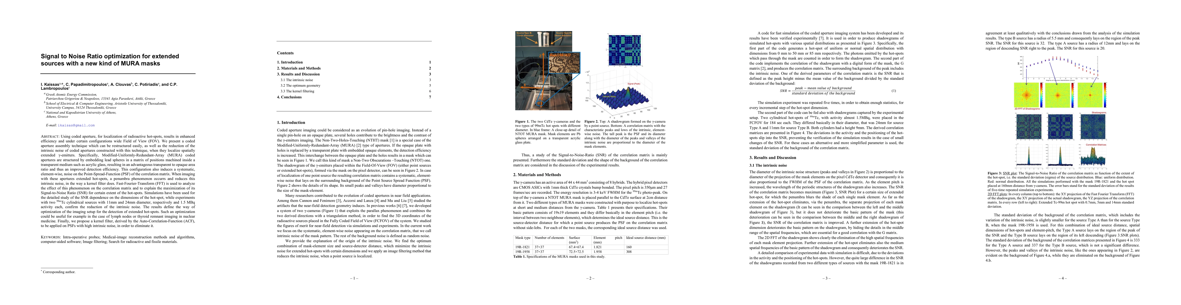Using coded aperture, for localization of radioactive hot-spots, results in enhanced efficiency and under certain configurations wide Field of View (FOV). We present a coded aperture assembly technique which can be restructured easily, as well as the reduction of the intrinsic noise of coded apertures constructed with this technique, when they localize spatially extended {\gamma}-emitters. Specifically, Modified-Uniformly-Redundant-Array (MURA) coded apertures are structured by embedding lead spheres in a matrix of positions machined inside a transparent medium such as acrylic glass, resulting in an advantageous transparent to opaque area ratio and thus an improved detection efficiency. This configuration also induces a systematic, element-wise, noise on the Point-Spread-Function (PSF) of the correlation matrix. When imaging with these apertures extended hot-spots, a penumbra phenomenon occurrs and reduces this intrinsic noise, in the way a kernel filter does. Fast-Fourier-Transform (FFT) is used to analyze the effect of this phenomenon on the correlation matrix and to explain the maximization of its Signal-to-Noise Ratio (SNR) for certain extent of the hot-spots. Simulations have been used for the detailed study of the SNR dependence on the dimensions of the hot-spot, while experiments with two 99mTc cylindrical sources with 11mm and 24mm diameter, respectively and 1.5 MBq activity each, confirm the reduction of the intrinsic noise. The results define the way of optimization of the imaging setup for the detection of extended hot-spots. Such an optimization could be useful for example in the case of lymph nodes or thyroid remnant imaging in nuclear medicine. Finally, we propose a kernel filter, derived by the Auto-Correlation-Function (ACF), to be applied on PSFs with high intrinsic noise, in order to eliminate it.