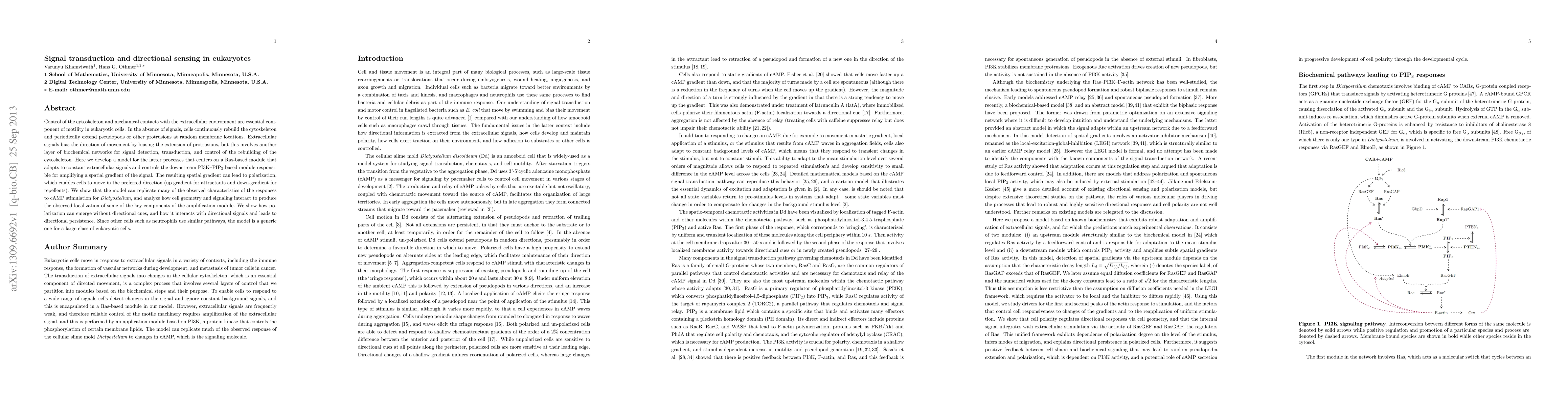 Control of the cytoskeleton and mechanical contacts with the extracellular environment are essential component of motility in eukaryotic cells. In the absence of signals, cells continuously rebuild the cytoskeleton and periodically extend pseudopods or other protrusions at random membrane locations. Extracellular signals bias the direction of movement by biasing the extension of protrusions, but this involves another layer of biochemical networks for signal detection, transduction, and control of the rebuilding of the cytoskeleton. Here we develop a model for the latter processes that centers on a Ras-based module that adapts to constant extracellular signals and controls the downstream PI3K-PIP3-based module responsible for amplifying a spatial gradient of the signal. The resulting spatial gradient can lead to polarization, which enables cells to move in the preferred direction (up gradient for attractants and down-gradient for repellents). We show that the model can replicate many of the observed characteristics of the responses to cAMP stimulation for Dictyostelium, and analyze how cell geometry and signaling interact to produce the observed localization of some of the key components of the amplification module. We show how polarization can emerge without directional cues, and how it interacts with directional signals and leads to directional persistence. Since other cells such as neutrophils use similar pathways, the model is a generic one for a large class of eukaryotic cells.