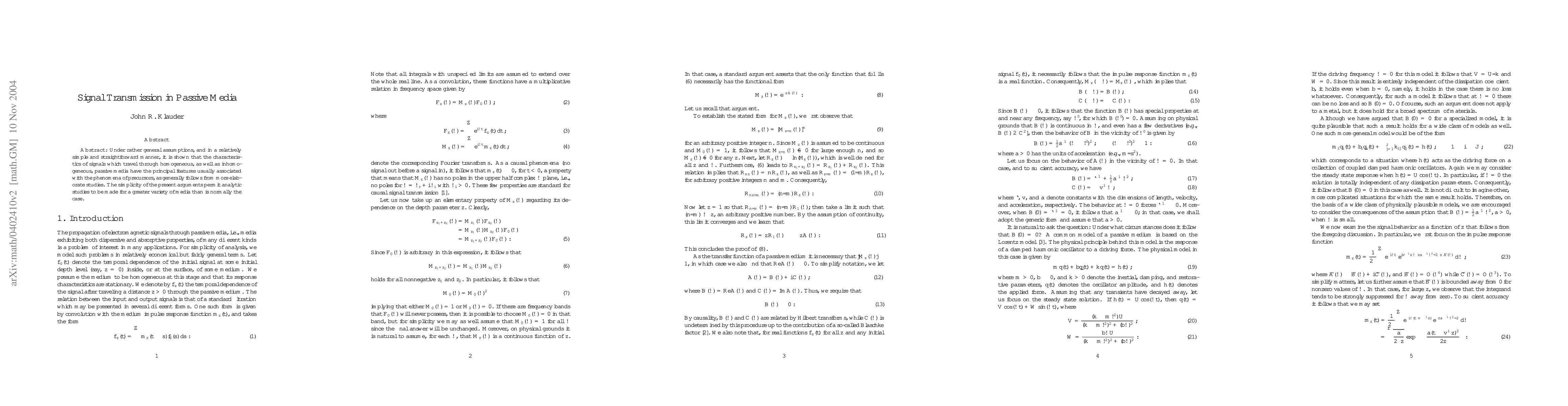 Under rather general assumptions, and in a relatively simple and straightforward manner, it is shown that the characteristics of signals which travel through homogeneous, as well as inhomogeneous, passive media have the principal features usually associated with the phenomena of precursors, as generally follows from more elaborate studies. The simplicity of the present arguments permit analytic studies to be made for a greater variety of media than is normally the case.