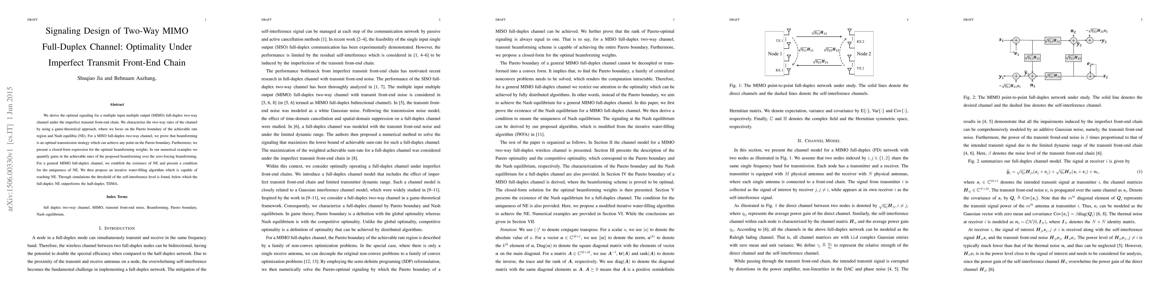 Researchers optimized signaling for two-way MIMO full-duplex channels with imperfect transmit front-end chains, finding that beamforming achieves any point on the Pareto boundary and proposing an algorithm to reach a Nash equilibrium.