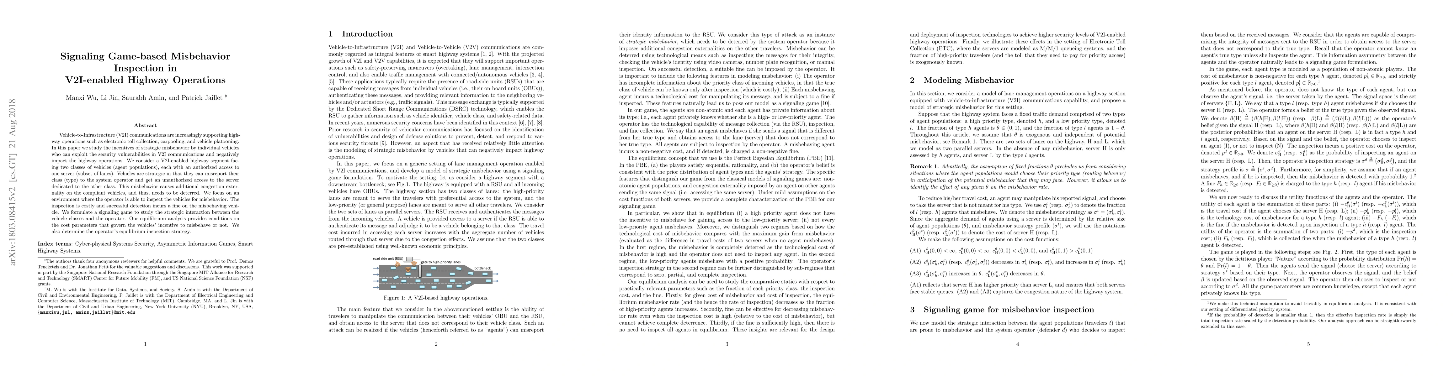 Vehicle-to-Infrastructure (V2I) communications are increasingly supporting highway operations such as electronic toll collection, carpooling, and vehicle platooning. In this paper we study the incentives of strategic misbehavior by individual vehicles who can exploit the security vulnerabilities in V2I communications and negatively impact the highway operations. We consider a V2I-enabled highway segment facing two classes of vehicles (agent populations), each with an authorized access to one server (subset of lanes). Vehicles are strategic in that they can misreport their class (type) to the system operator and get an unauthorized access to the server dedicated to the other class. This misbehavior causes additional congestion externality on the compliant vehicles, and thus, needs to be deterred. We focus on an environment where the operator is able to inspect the vehicles for misbehavior. The inspection is costly and successful detection incurs a fine on the misbehaving vehicle. We formulate a signaling game to study the strategic interaction between the vehicle classes and the operator. Our equilibrium analysis provides conditions on the cost parameters that govern the vehicles' incentive to misbehave or not. We also determine the operator's equilibrium inspection strategy.