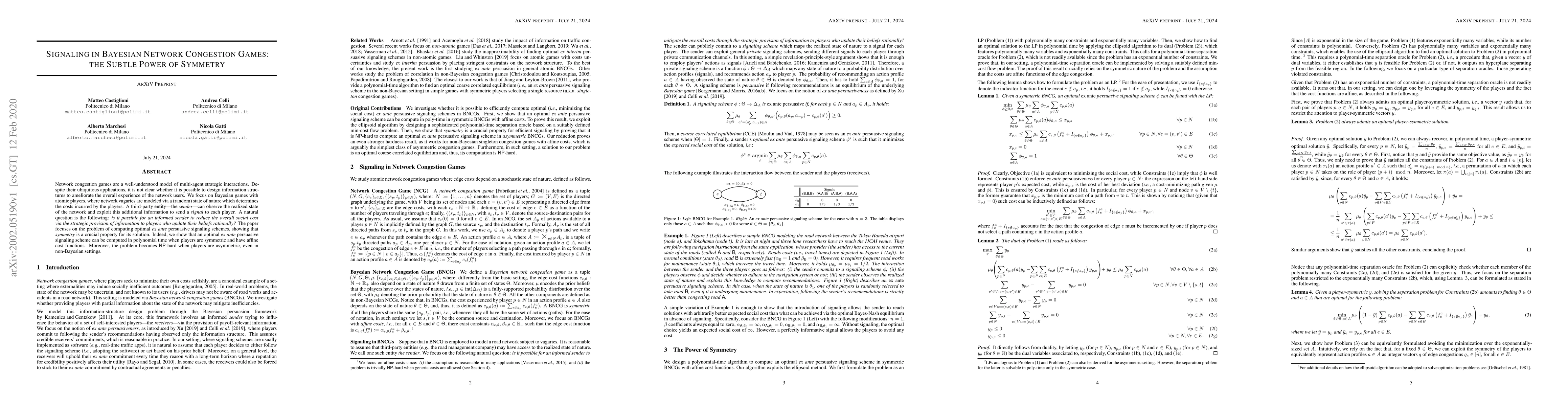 The paper introduces a polynomial-time algorithm for computing optimal ex ante persuasive signaling schemes in symmetric Bayesian Network Congestion Games with affine cost functions, and proves NP-hardness for asymmetric cases.
