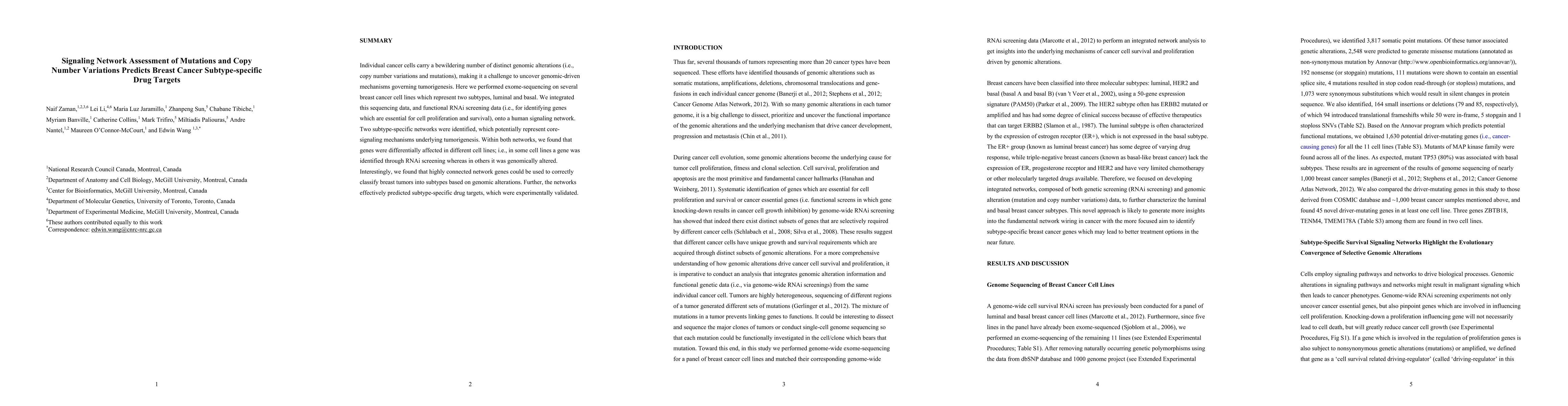 Individual cancer cells carry a bewildering number of distinct genomic alterations i.e., copy number variations and mutations, making it a challenge to uncover genomic-driven mechanisms governing tumorigenesis. Here we performed exome-sequencing on several breast cancer cell lines which represent two subtypes, luminal and basal. We integrated this sequencing data, and functional RNAi screening data (i.e., for identifying genes which are essential for cell proliferation and survival), onto a human signaling network. Two subtype-specific networks were identified, which potentially represent core-signaling mechanisms underlying tumorigenesis. Within both networks, we found that genes were differentially affected in different cell lines; i.e., in some cell lines a gene was identified through RNAi screening whereas in others it was genomically altered. Interestingly, we found that highly connected network genes could be used to correctly classify breast tumors into subtypes based on genomic alterations. Further, the networks effectively predicted subtype-specific drug targets, which were experimentally validated.