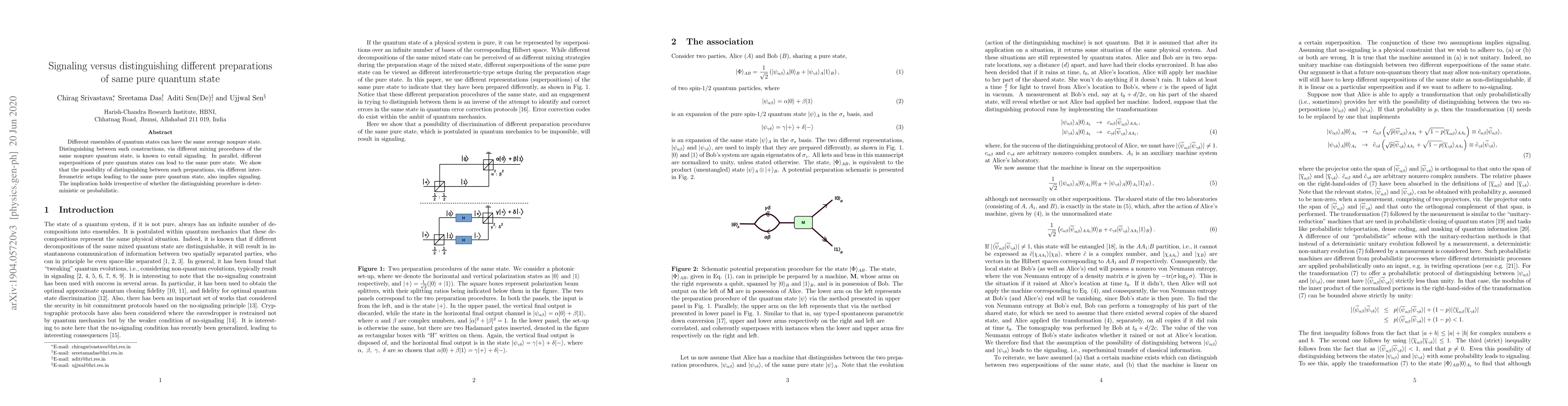 Different ensembles of quantum states can have the same average nonpure state. Distinguishing between such constructions, via different mixing procedures of the same nonpure quantum state, is known to entail signaling. In parallel, different superpositions of pure quantum states can lead to the same pure state. We show that the possibility of distinguishing between such preparations, via different interferometric setups leading to the same pure quantum state, also implies signaling. The implication holds irrespective of whether the distinguishing procedure is deterministic or probabilistic.