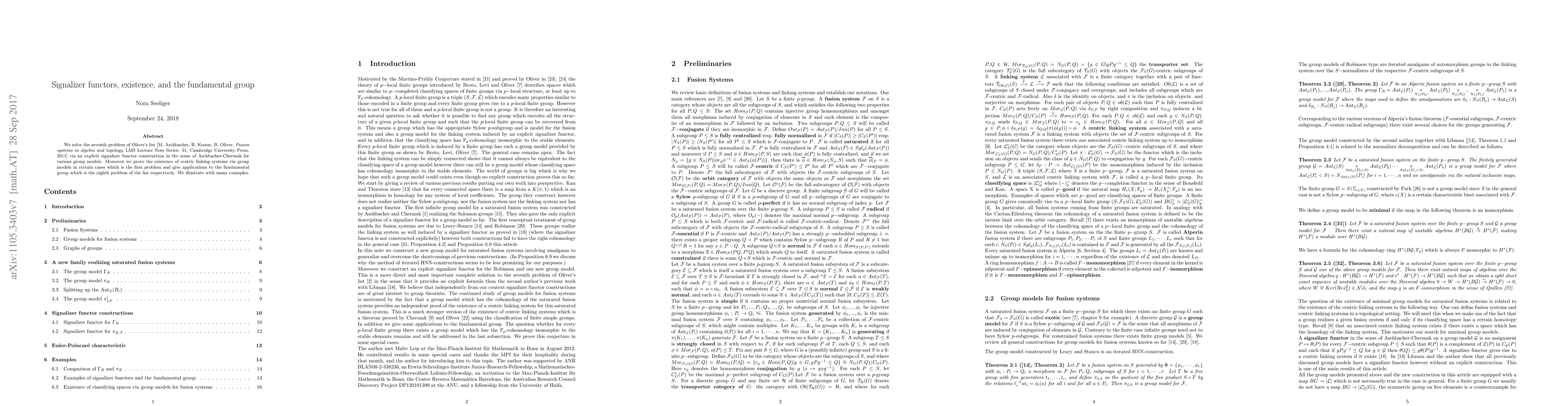 We solve the seventh problem of Oliver's list [M.\ Aschbacher, R.\ Kessar, B.\ Oliver, \textit{Fusion systems in algebra and topology}, LMS Lecture Note Series: 31, Cambridge University Press, 2011] via an explicit signalizer functor construction in the sense of Aschbacher-Chermak for various group models. Moreover we prove the existence of centric linking systems via group models in certain cases which is the first problem and give applications to the fundamental group which is the eighth problem of the list respectively. We illustrate with many examples.