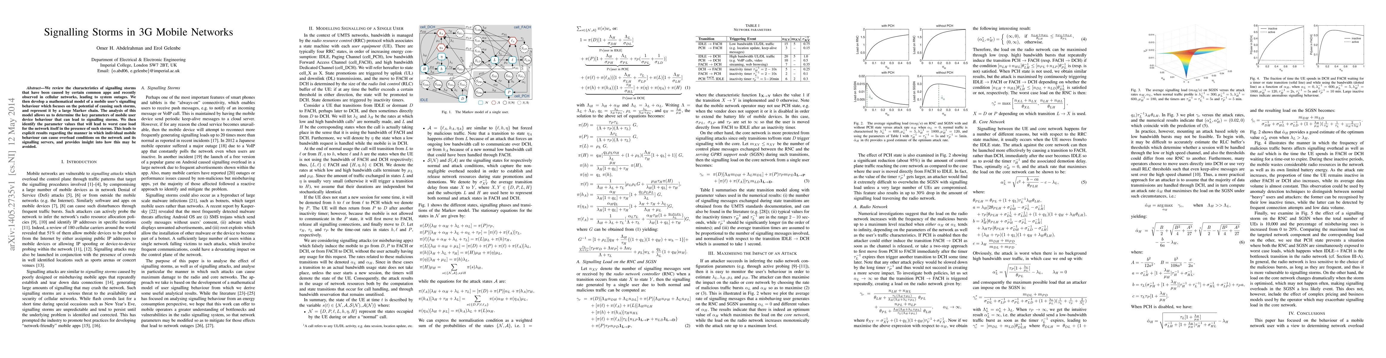 We review the characteristics of signalling storms that have been caused by certain common apps and recently observed in cellular networks, leading to system outages. We then develop a mathematical model of a mobile user's signalling behaviour which focuses on the potential of causing such storms, and represent it by a large Markov chain. The analysis of this model allows us to determine the key parameters of mobile user device behaviour that can lead to signalling storms. We then identify the parameter values that will lead to worst case load for the network itself in the presence of such storms. This leads to explicit results regarding the manner in which individual mobile behaviour can cause overload conditions on the network and its signalling servers, and provides insight into how this may be avoided.