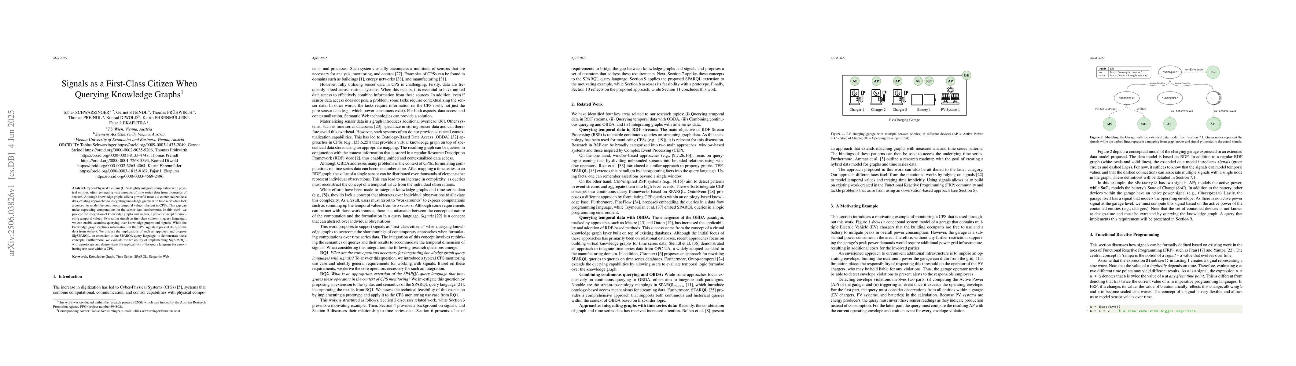 Cyber-Physical Systems (CPSs) tightly integrate computation with physical entities, often generating vast amounts of time series data from thousands of sensors. Although knowledge graphs offer a powerful means to contextualize these data, existing approaches to integrating knowledge graphs with time series data lack a concept to model the continuous temporal values inherent in CPSs. This gap can make expressing computations on the sensor data cumbersome. In this work, we propose the integration of knowledge graphs and signals, a proven concept for modeling temporal values. By treating signals as first-class citizens in query languages, we can enable seamless querying over knowledge graphs and signals. While the knowledge graph captures information on the CPS, signals represent its run-time data from sensors. We discuss the implications of such an approach and propose SigSPARQL, an extension to the SPARQL query language, to demonstrate these concepts. Furthermore, we evaluate the feasibility of implementing SigSPARQL with a prototype and demonstrate the applicability of the query language for a monitoring use case within a CPS.