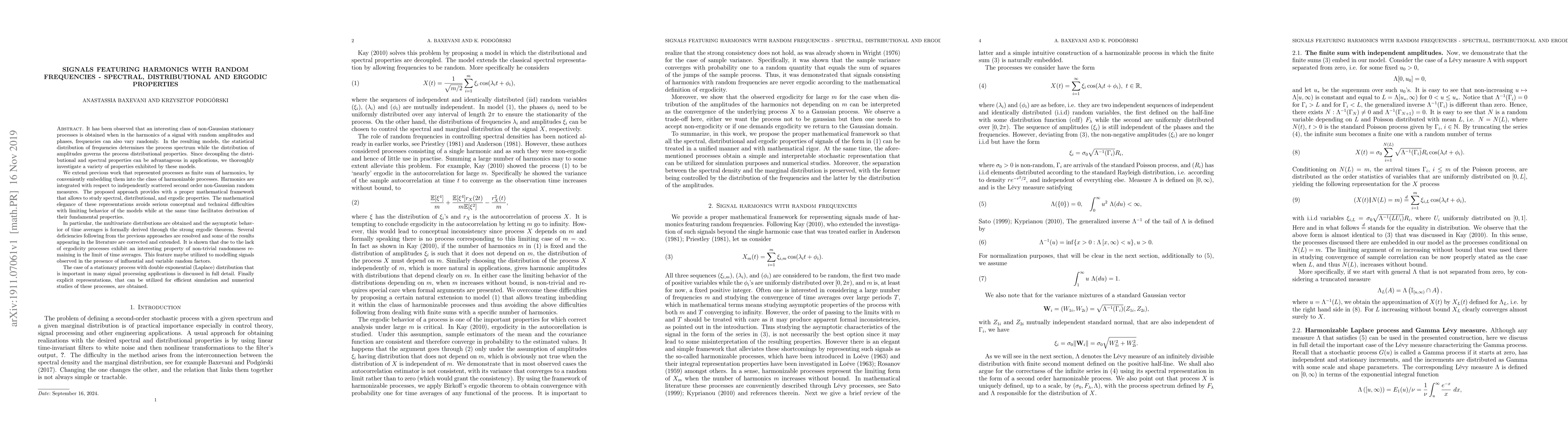 It has been observed that an interesting class of non-Gaussian stationary processes is obtained when in the harmonics of a signal with random amplitudes and phases, frequencies can also vary randomly. In the resulting models, the statistical distribution of frequencies determines the process spectrum while the distribution of amplitudes governs the process distributional properties. Since decoupling the distributional and spectral properties can be advantageous in applications, we thoroughly investigate a variety of properties exhibited by these models. We extend previous work that represented processes as finite sum of harmonics, by conveniently embedding them into the class of harmonizable processes. Harmonics are integrated with respect to independently scattered second order non-Gaussian random measures. The proposed approach provides with a proper mathematical framework that allows to study spectral, distributional, and ergodic properties. The mathematical elegance of these representations avoids serious conceptual and technical difficulties with limiting behavior of the models while at the same time facilitates derivation of their fundamental properties. In particular, the multivariate distributions are obtained and the asymptotic behavior of time averages is formally derived through the strong ergodic theorem. Several deficiencies following from the previous approaches are resolved and some of the results appearing in the literature are corrected and extended. It is shown that due to the lack of ergodicity processes exhibit an interesting property of non-trivial randomness remaining in the limit of time averages. This feature maybe utilized to modelling signals observed in the presence of influential and variable random factors.