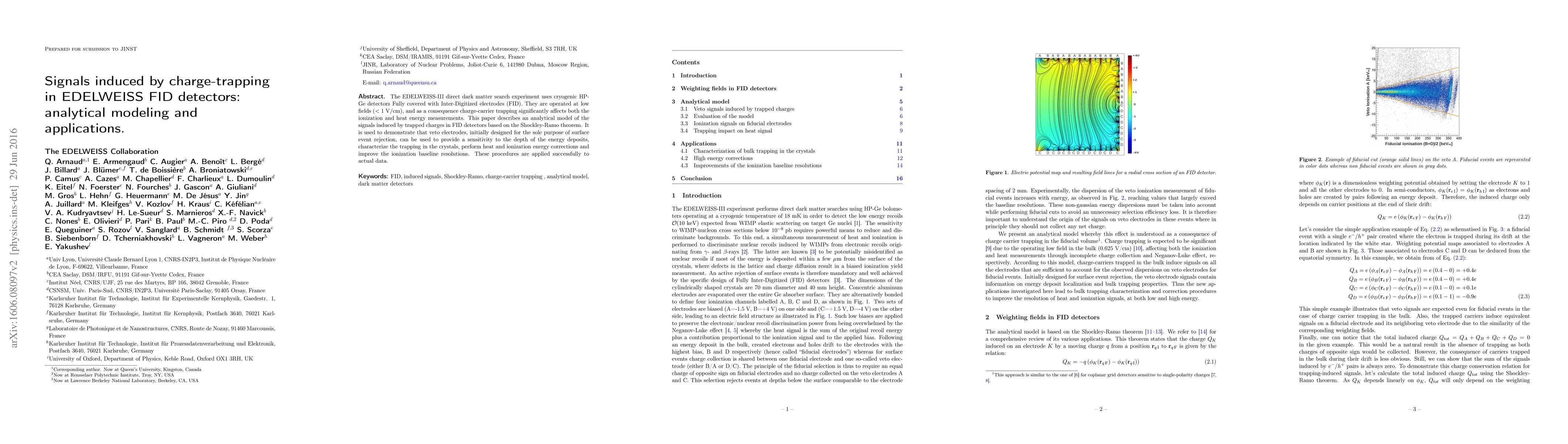 The EDELWEISS-III direct dark matter search experiment uses cryogenic HP-Ge detectors Fully covered with Inter-Digitized electrodes (FID). They are operated at low fields ($<1\;\mathrm{V/cm}$), and as a consequence charge-carrier trapping significantly affects both the ionization and heat energy measurements. This paper describes an analytical model of the signals induced by trapped charges in FID detectors based on the Shockley-Ramo theorem. It is used to demonstrate that veto electrodes, initially designed for the sole purpose of surface event rejection, can be used to provide a sensitivity to the depth of the energy deposits, characterize the trapping in the crystals, perform heat and ionization energy corrections and improve the ionization baseline resolutions. These procedures are applied successfully to actual data.