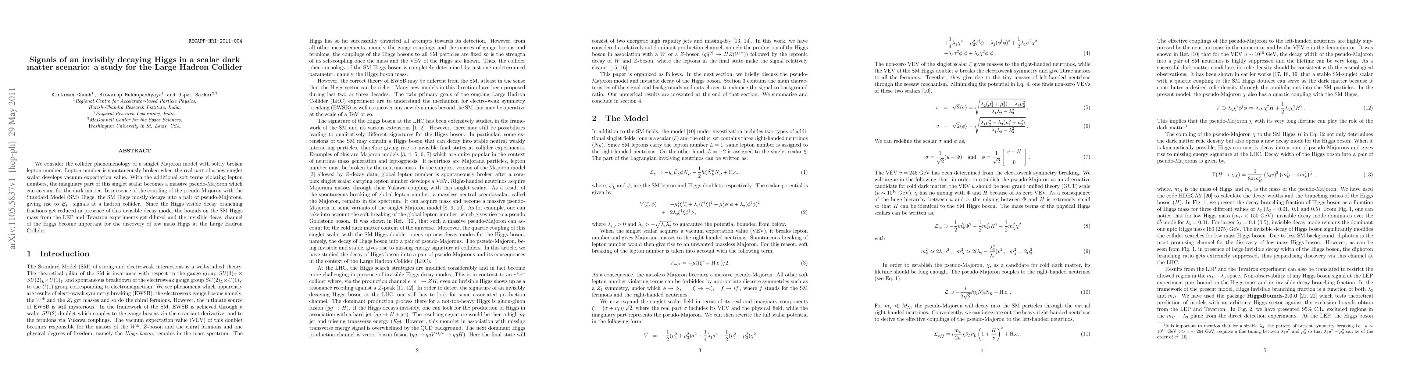 We consider the collider phenomenology of a singlet Majoron model with softly broken lepton number. Lepton number is spontaneously broken when the real part of a new singlet scalar develops vacuum expectation value. With the additional soft terms violating lepton numbers, the imaginary part of this singlet scalar becomes a massive pseudo-Majoron which can account for the dark matter. In presence of the coupling of the pseudo-Majoron with the Standard Model (SM) Higgs, the SM Higgs mostly decays into a pair of pseudo-Majorons, giving rise to missing transverse energy signals at a hadron collider. Since the Higgs visible decay branching fractions get reduced in presence of this invisible decay mode, the bounds on the SM Higgs mass from the LEP and Tevatron experiments get diluted and the invisible decay channel of the Higgs become important for the discovery of low mass Higgs at the Large Hadron Collider.