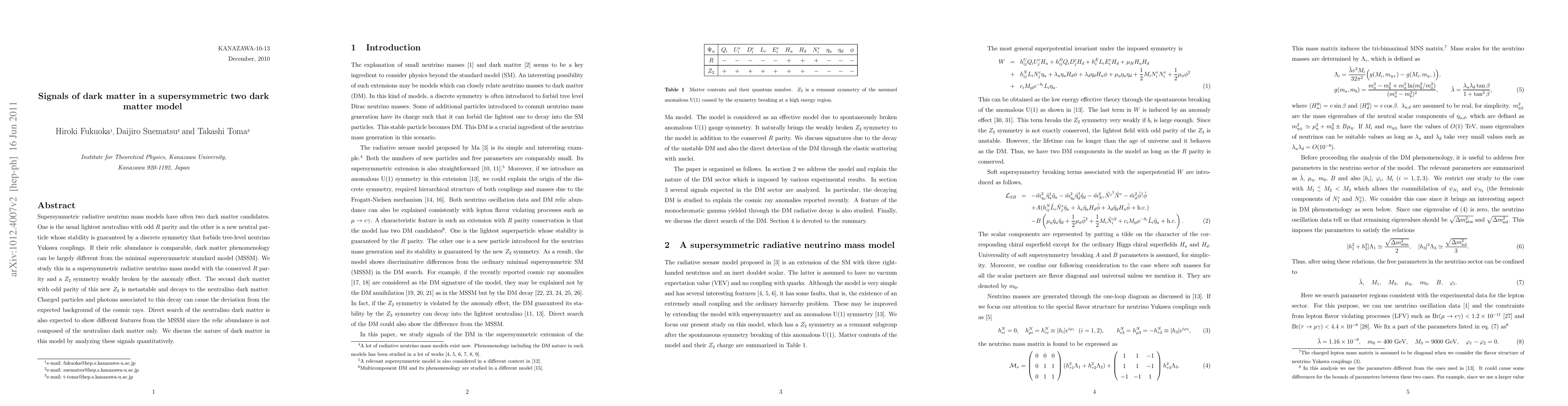 This paper explores a supersymmetric radiative neutrino mass model with two dark matter candidates: a usual lightest neutralino and a metastable new neutral particle. It examines how their comparable relic abundance alters dark matter phenomenology, focusing on potential signals from the decay of the new particle and deviations in cosmic ray backgrounds, as well as differences in direct neutralino dark matter searches compared to the minimal supersymmetric standard model.