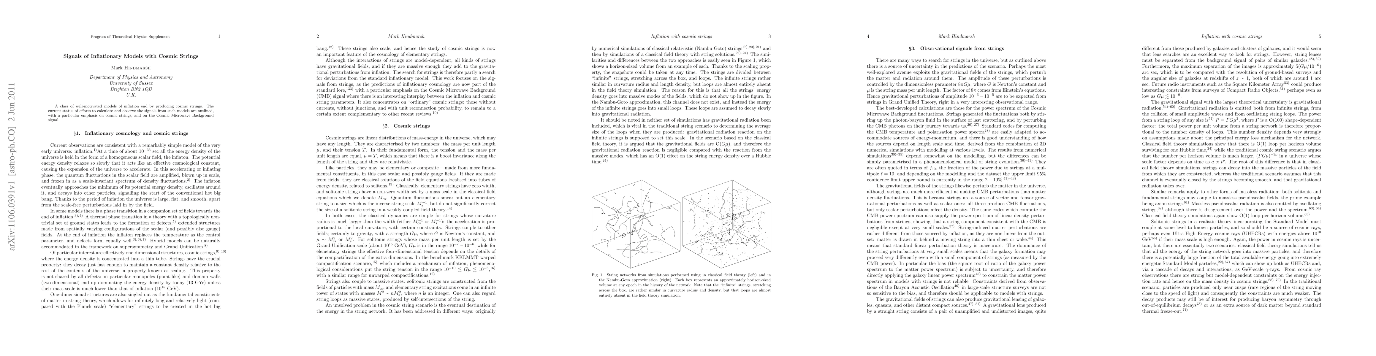 A class of well-motivated models of inflation end by producing cosmic strings. The current status of efforts to calculate and observe the signals from such models are outlined, with a particular emphasis on cosmic strings, and on the Cosmic Microwave Background signal.