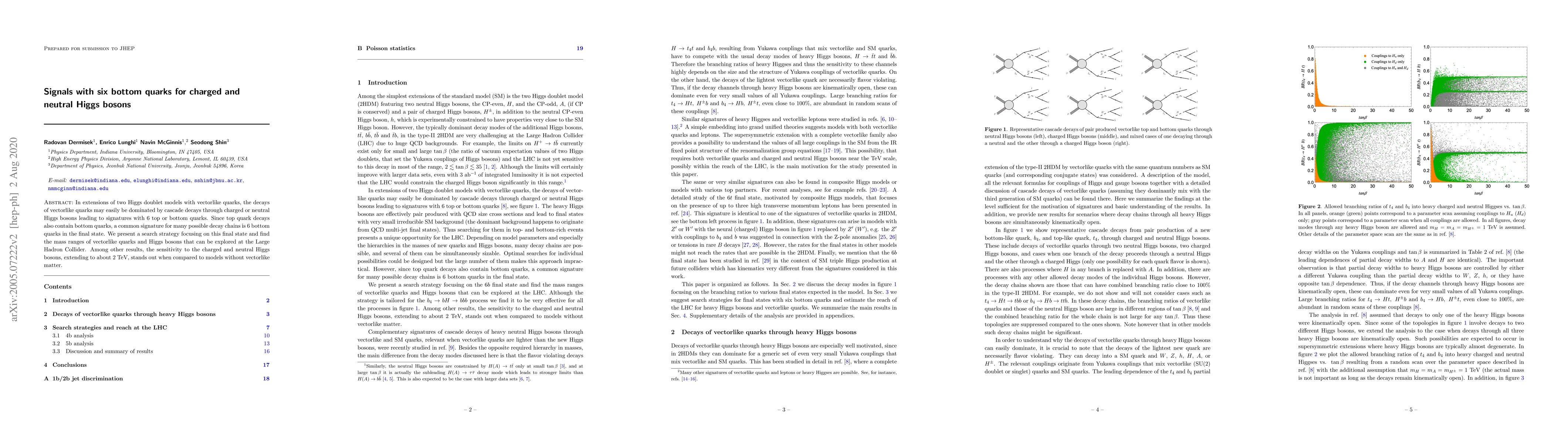 This paper explores the potential for detecting six bottom quarks in the final state from cascade decays involving vectorlike quarks in extended two Higgs doublet models. It proposes a search strategy for the Large Hadron Collider, highlighting the ability to probe mass ranges of vectorlike quarks and Higgs bosons up to about 2 TeV, with particular sensitivity to charged and neutral Higgs bosons.