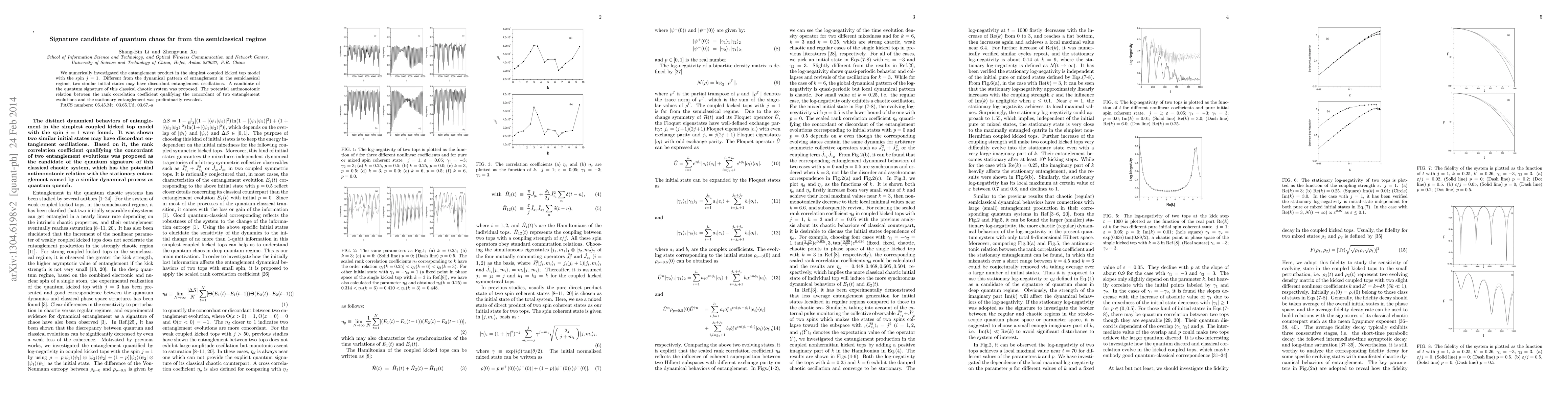 We numerically investigated the entanglement product in the simplest coupled kicked top model with the spin $j=1$. Different from the dynamical pattern of entanglement in the semiclassical regime, two similar initial states may have discordant entanglement oscillations. A candidate of the quantum signature of this classical chaotic system was proposed. The potential antimonotonic relation between the rank correlation coefficient qualifying the concordant of two entanglement evolutions and the stationary entanglement was preliminarily revealed.