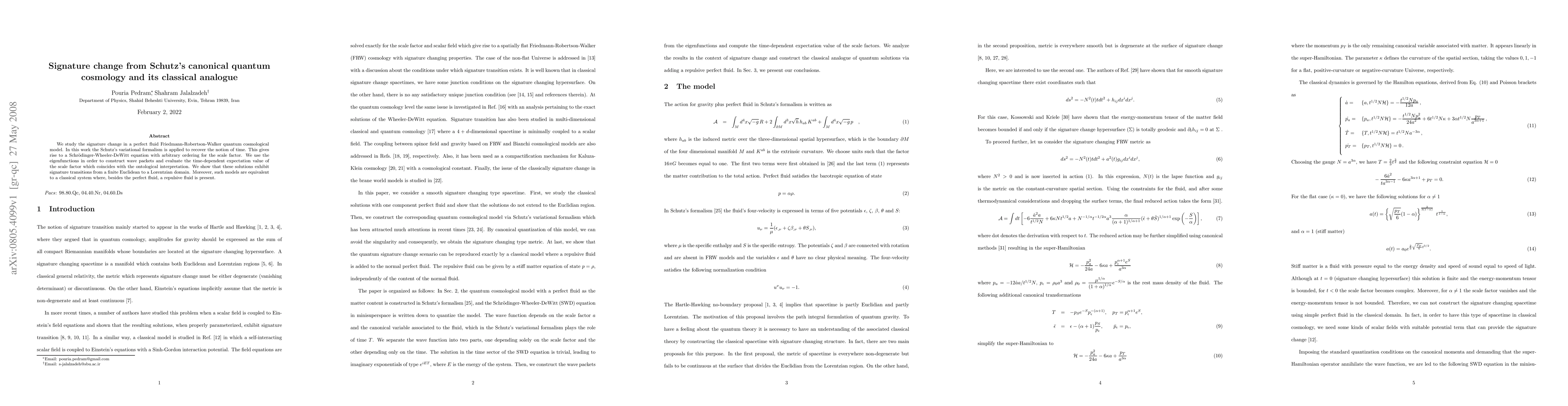 This paper investigates signature changes in a quantum cosmological model using Schutz's variational formalism, leading to a Schrödinger-Wheeler-DeWitt equation. It demonstrates signature transitions from Euclidean to Lorentzian domains and finds equivalence to a classical system with both perfect and repulsive fluids.