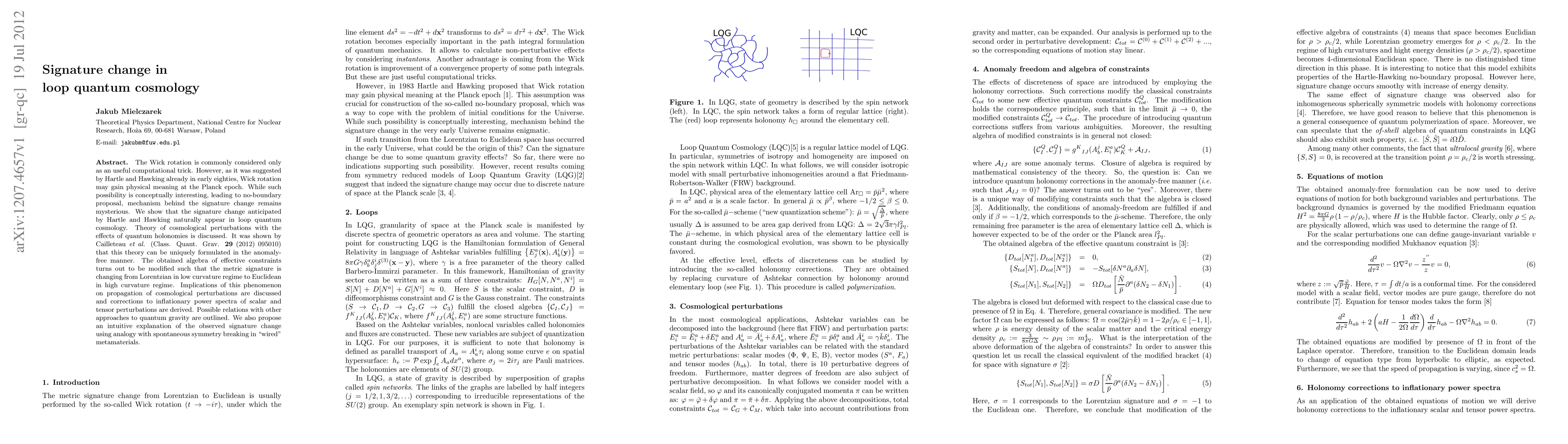 The paper explores how loop quantum cosmology naturally realizes the signature change in spacetime, transitioning from Lorentzian to Euclidean metrics, and discusses its implications for cosmological perturbations and inflationary power spectra. An intuitive analogy with spontaneous symmetry breaking in metamaterials is also proposed to explain the observed signature change.
