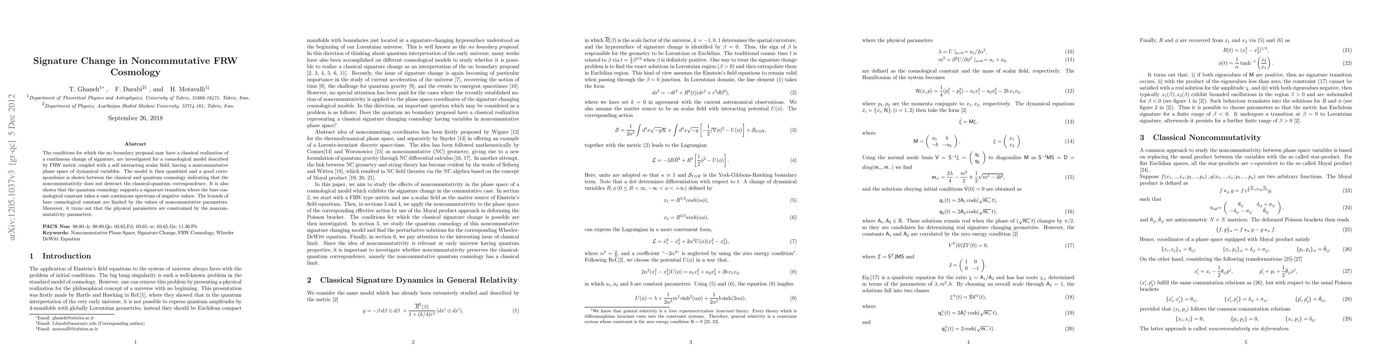 This paper explores conditions for a continuous signature change in noncommutative FRW cosmology under the no boundary proposal, demonstrating that noncommutativity preserves classical-quantum correspondence. It finds that quantum cosmology supports a vast continuous spectrum of negative bare cosmological constants bounded by noncommutative parameters, constraining physical parameters through noncommutativity.