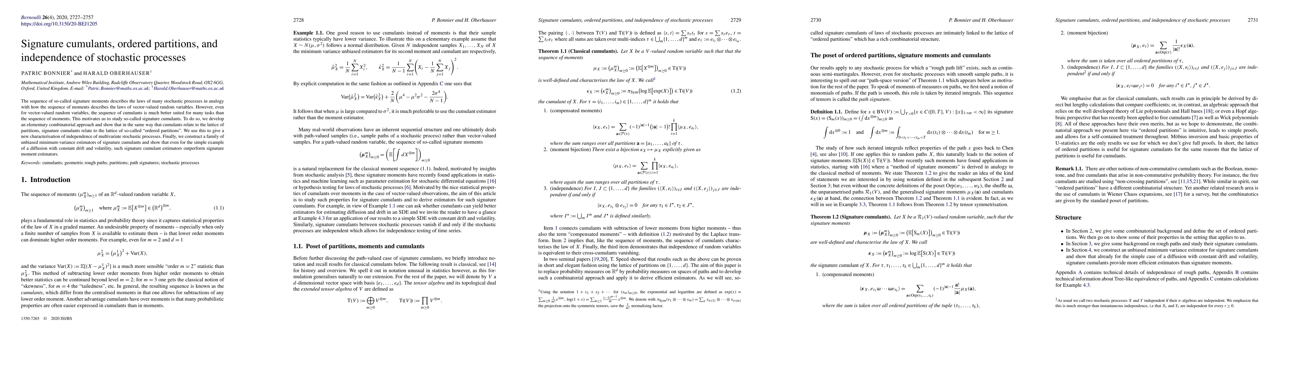 This paper develops a combinatorial approach to study signature cumulants, analogous to cumulants for vector-valued random variables, and relates them to ordered partitions. It provides a new characterization of independence for multivariate stochastic processes and constructs unbiased minimum-variance estimators for signature cumulants.