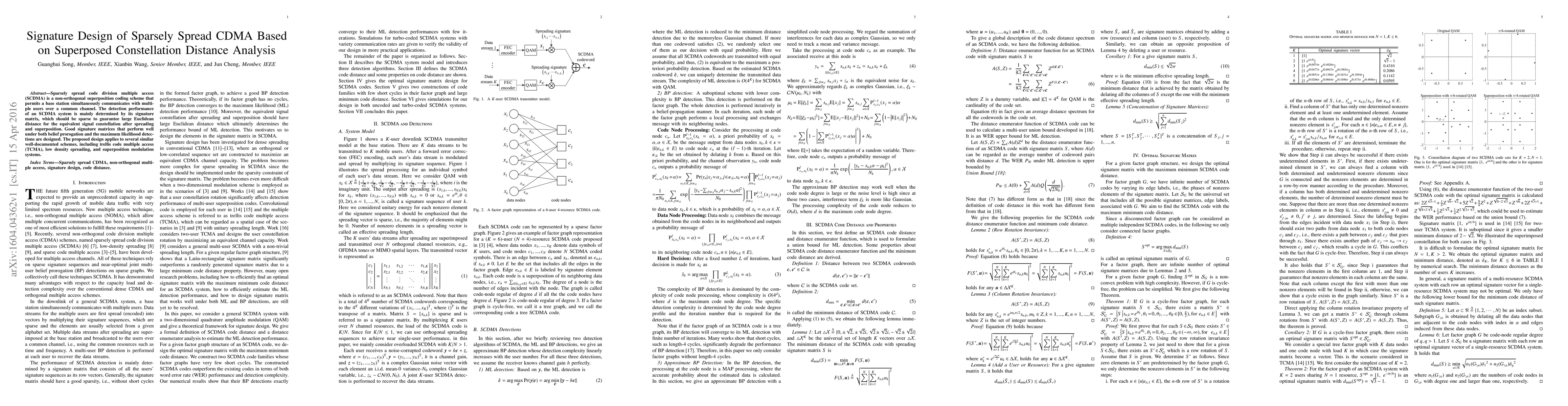 Sparsely spread code division multiple access (SCDMA) is a non-orthogonal superposition coding scheme that permits a base station simultaneously communicates with multiple users over a common channel. The detection performance of an SCDMA system is mainly determined by its signature matrix, which should be sparse to guarantee large Euclidean distance for the equivalent signal constellation after spreading and superposition. Good signature matrices that perform well under both belief prorogation and the maximum likelihood detections are designed. The proposed design applies to several similar well-documented schemes, including trellis code multiple access (TCMA), low density spreading, and superposition modulation systems.
