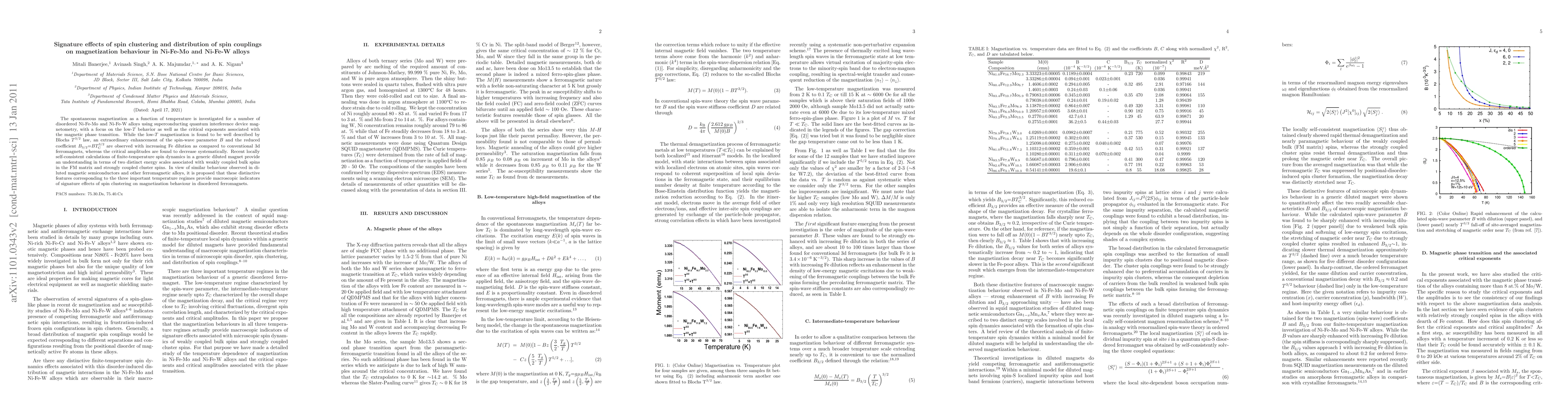 The spontaneous magnetization as a function of temperature is investigated for a number of disordered Ni-Fe-Mo and Ni-Fe-W alloys using superconducting quantum interference device magnetometry, with a focus on the low-T behavior as well as the critical exponents associated with the magnetic phase transition. While the low-T magnetization is found to be well described by Bloch's T^{3/2} law, an extraordinary enhancement of the spin-wave parameter B and the reduced coefficient B_{3/2}=BT_C ^{3/2} are observed with increasing Fe dilution as compared to conventional 3d ferromagnets, whereas the critical amplitudes are found to decrease systematically. Recent locally self-consistent calculations of finite-temperature spin dynamics in a generic diluted magnet provide an understanding in terms of two distinct energy scales associated with weakly coupled bulk spins in the FM matrix and strongly coupled cluster spins. In view of similar behaviour observed in diluted magnetic semiconductors and other ferromagnetic alloys, it is proposed that these distinctive features corresponding to the three important temperature regimes provide macroscopic indicators of signature effects of spin clustering on magnetization behaviour in disordered ferromagnets.