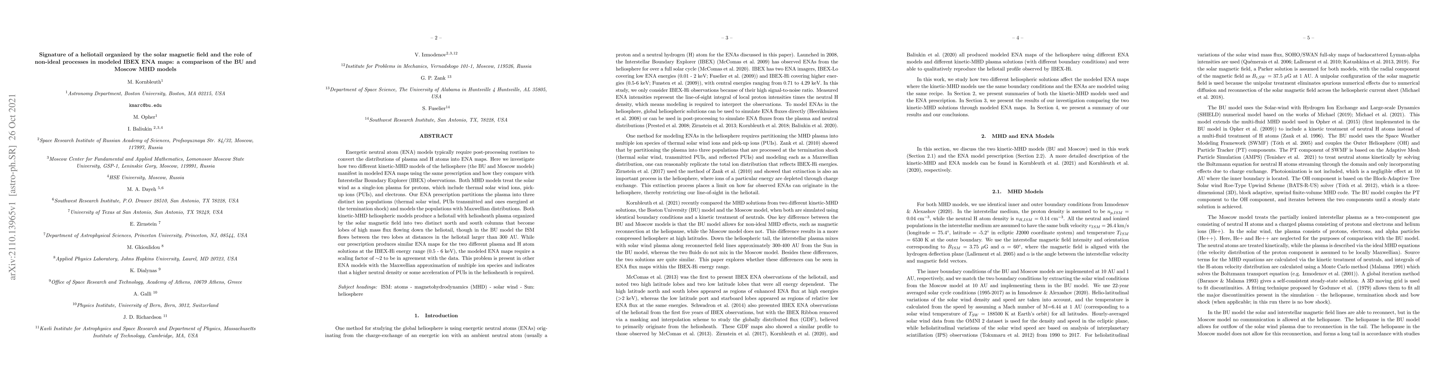 This paper compares two kinetic-MHD models (BU and Moscow) of the heliosphere, showing both produce a heliotail organized by the solar magnetic field into north and south columns. Despite similar ENA maps at the IBEX-Hi energy range, the models require a scaling factor of ~2 to match observations, suggesting a need for higher neutral density or PUI acceleration in the heliosheath.