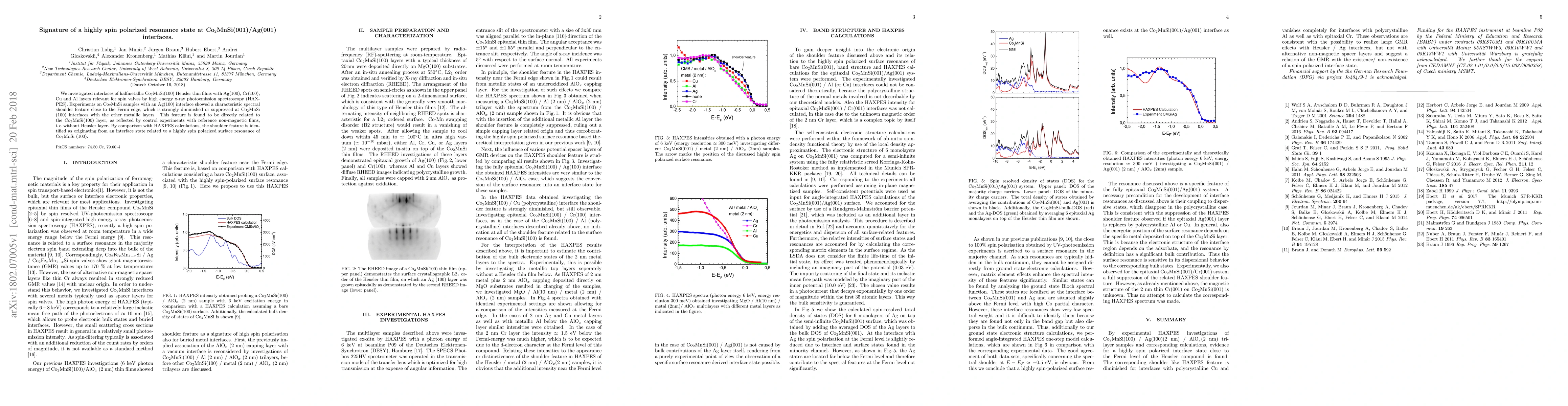This study identifies a highly spin polarized resonance state at the Co2MnSi(001)/Ag(001) interface through high energy x-ray photoemission spectroscopy, distinguishing it from interfaces with other metals. The unique spectral shoulder feature near the Fermi edge is attributed to an interface state resulting from the Co2MnSi layer.