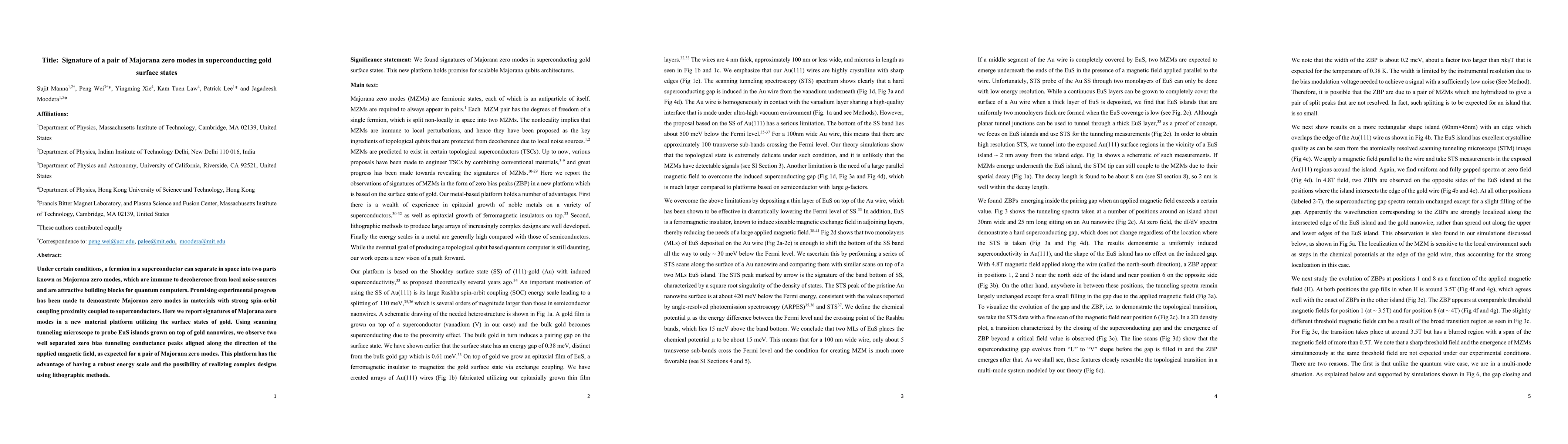 This paper reports the observation of signatures of Majorana zero modes in gold surface states via scanning tunneling microscopy, indicating potential for robust quantum computing components. The study utilizes EuS islands on gold nanowires, revealing zero bias peaks indicative of these modes, with the platform offering a stable energy scale and lithographic design flexibility.