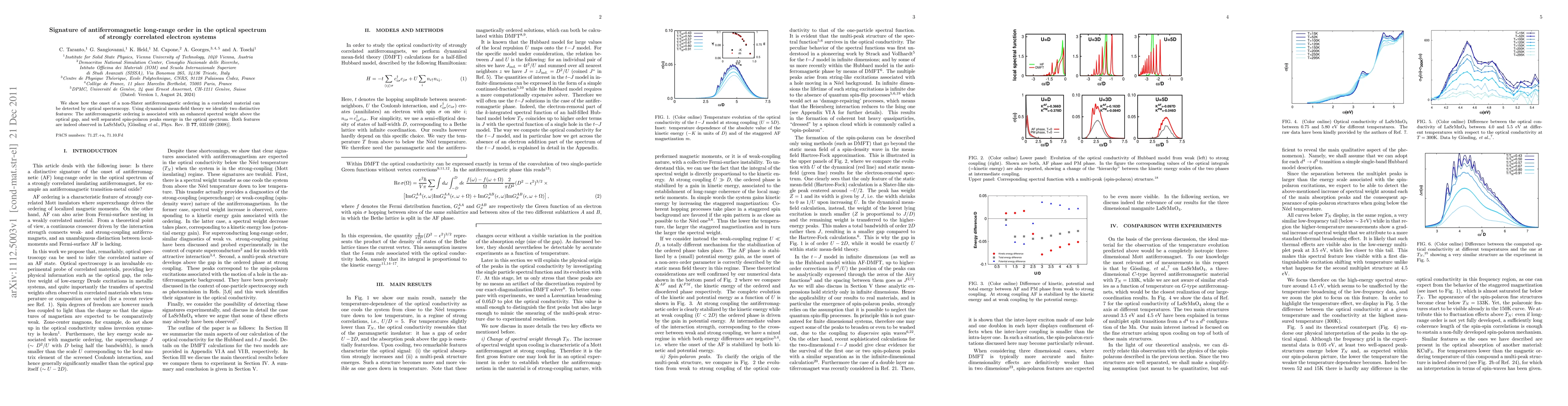 We show how the onset of a non-Slater antiferromagnetic ordering in a correlated material can be detected by optical spectroscopy. Using dynamical mean-field theory we identify two distinctive features: The antiferromagnetic ordering is associated with an enhanced spectral weight above the optical gap, and well separated spin-polaron peaks emerge in the optical spectrum. Both features are indeed observed in LaSrMnO_4 [G\"ossling et al., Phys. Rev. B 77, 035109 (2008)]