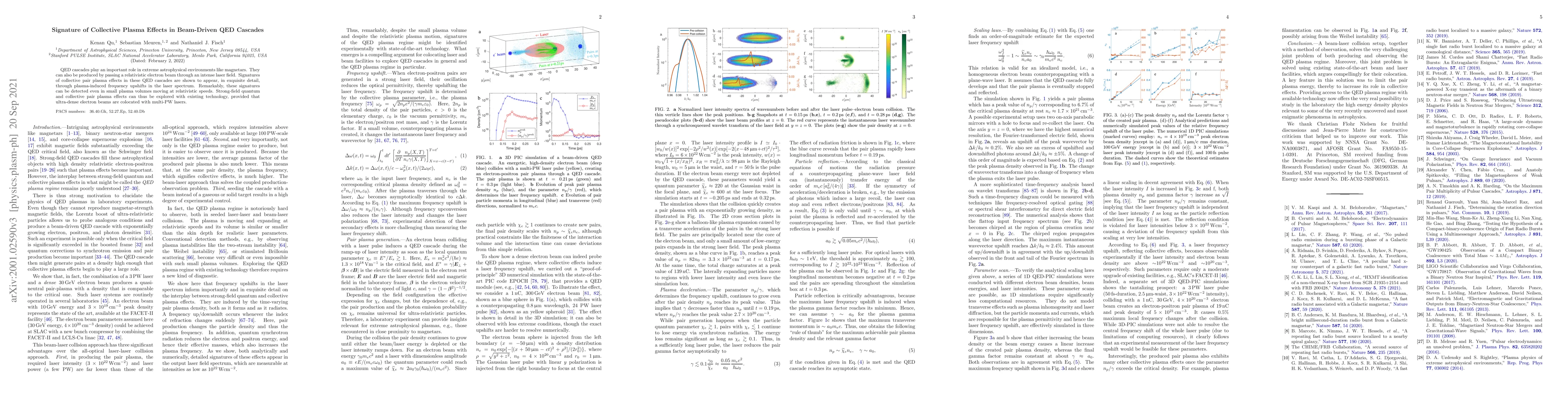 This paper investigates the signatures of collective plasma effects in beam-driven QED cascades, revealing plasma-induced frequency upshifts in laser spectra. These signatures can be detected in small, relativistically moving plasma volumes, enabling exploration of strong-field quantum and collective pair plasma phenomena with current technology.