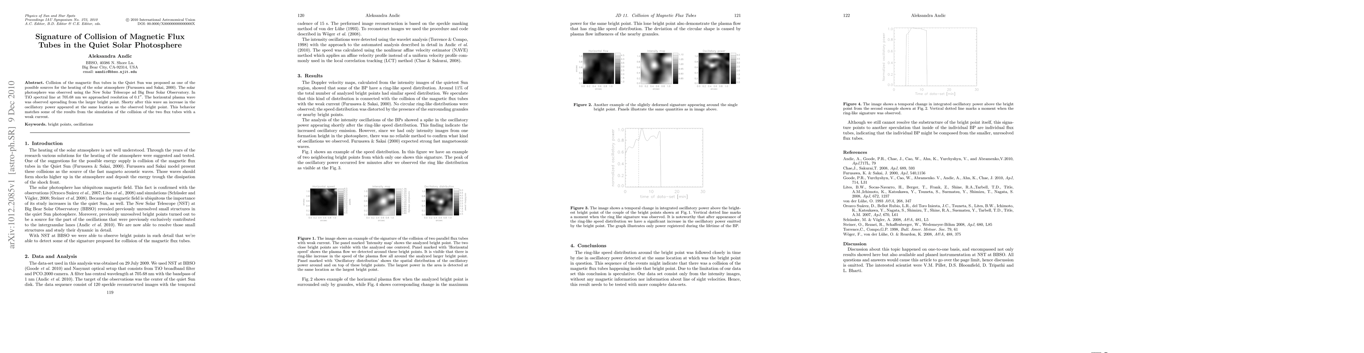 Collision of the magnetic flux tubes in the Quiet Sun was proposed as one of the possible sources for the heating of the solar atmosphere (Furusawa and Sakai, 2000). The solar photosphere was observed using the New Solar Telescope ad Big Bear Solar Observatory. In TiO spectral line at 705.68 nm we approached resolution of 0.1". The horizontal plasma wave was observed spreading from the larger bright point. Shorty after this wave an increase in the oscillatory power appeared at the same location as the observed bright point. This behavior matches some of the results from the simulation of the collision of the two flux tubes with a weak current.