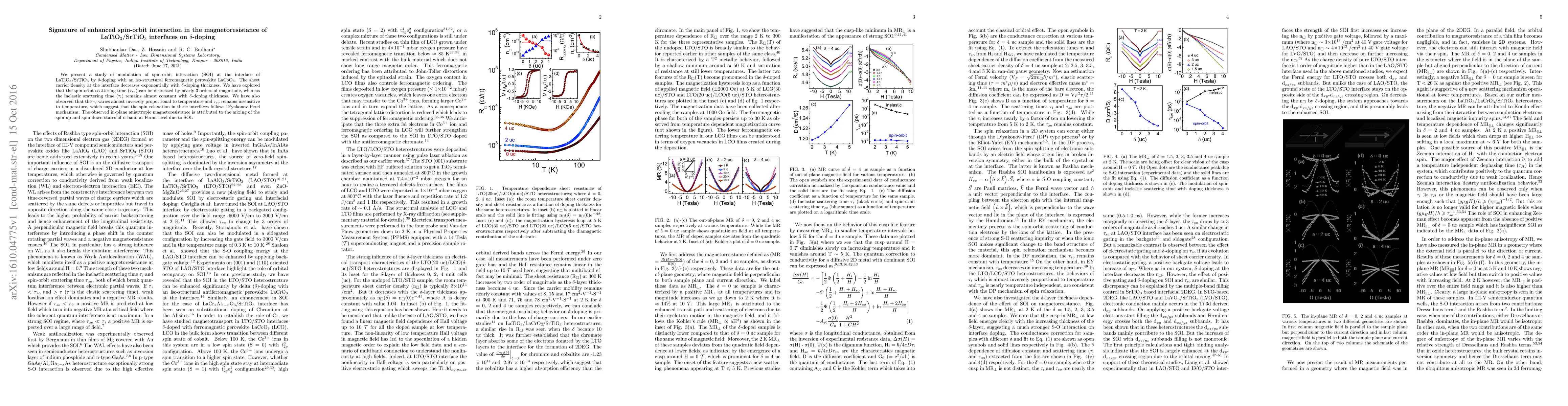This study investigates the modulation of spin-orbit interaction at LaTiO$_3$/SrTiO$_3$ interfaces via $\delta$-doping with LaCoO$_3$, revealing a significant decrease in spin-orbit scattering time by three orders of magnitude while maintaining constant inelastic scattering time. The resulting anisotropic magnetoresistance is linked to spin-up and spin-down state mixing due to enhanced spin-orbit interaction.