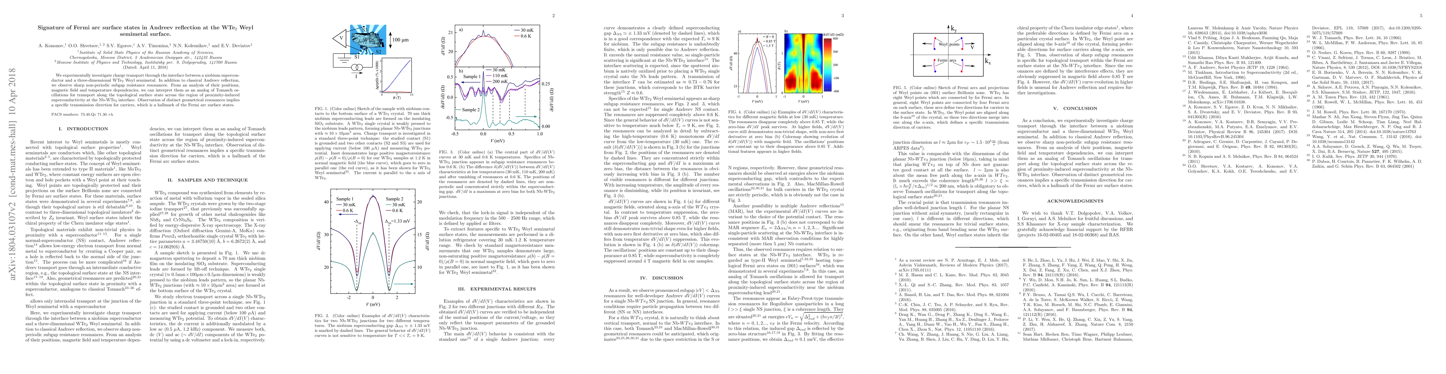 This study experimentally investigates charge transport at the interface between a niobium superconductor and WTe$_2$ Weyl semimetal, revealing sharp subgap resistance resonances indicative of Fermi arc surface states. These resonances, analogous to Tomasch oscillations, signify specific carrier transmission directions along the topological surface state.