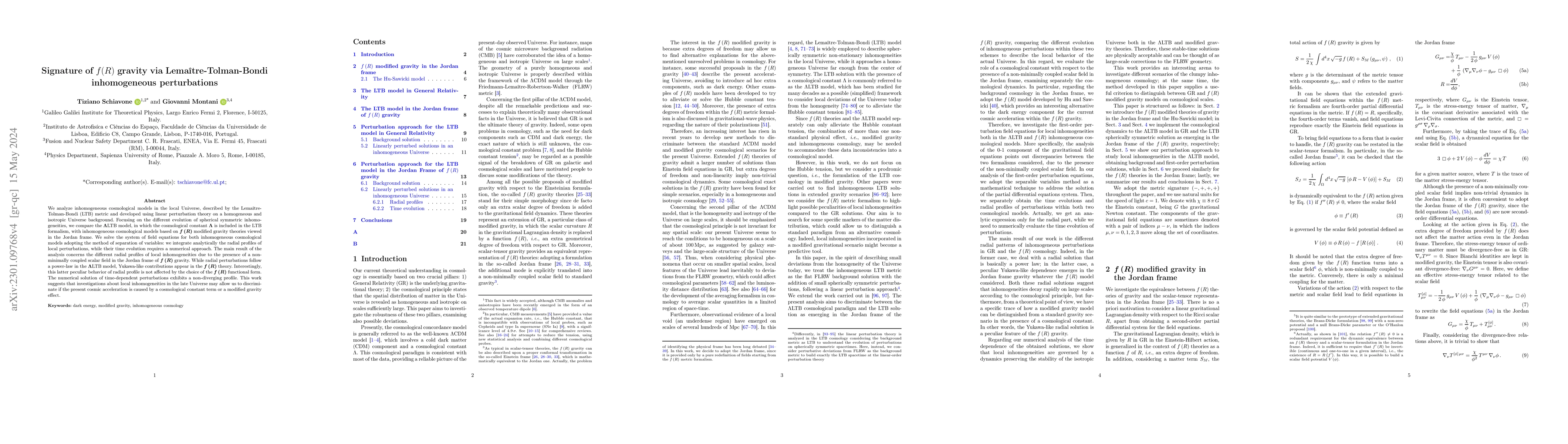 This paper examines inhomogeneous cosmological models using the Lemaître-Tolman-Bondi metric, comparing $\Lambda$LTB models with $f(R)$ modified gravity theories. It finds distinct radial profiles in $f(R)$ models due to a non-minimally coupled scalar field, suggesting that local inhomogeneities could help determine the origin of cosmic acceleration.