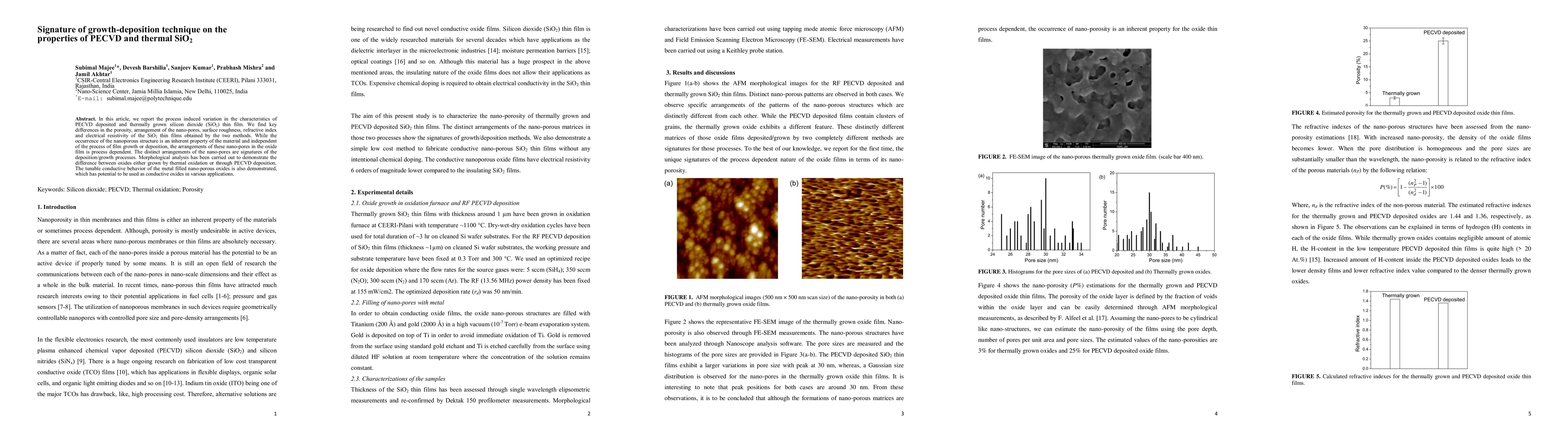 This paper investigates the differences in properties of silicon dioxide (SiO2) thin films grown by plasma-enhanced chemical vapor deposition (PECVD) and thermal oxidation, revealing variations in porosity, nano-pore arrangement, surface roughness, refractive index, and electrical resistivity. The distinct nano-pore arrangements signify the growth-deposition technique, with potential applications in conductive oxides.