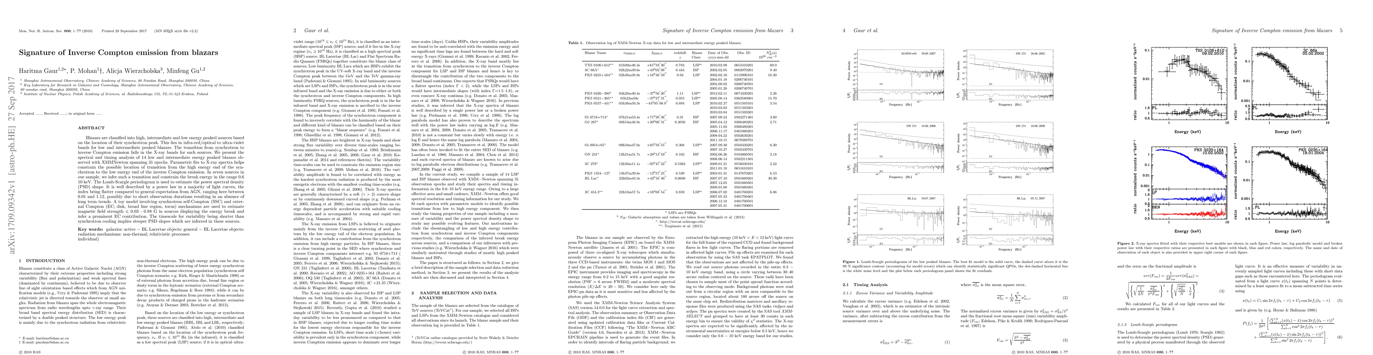 The research methodology involved spectral and timing analysis of 14 low and intermediate energy peaked blazars observed with XMM-Newton spanning 31 epochs. Parametric fits to X-ray spectra were used to constrain the possible location of transition from synchrotron to inverse Compton emission, and Lomb-Scargle periodogram was employed to estimate the power spectral density (PSD) shape.