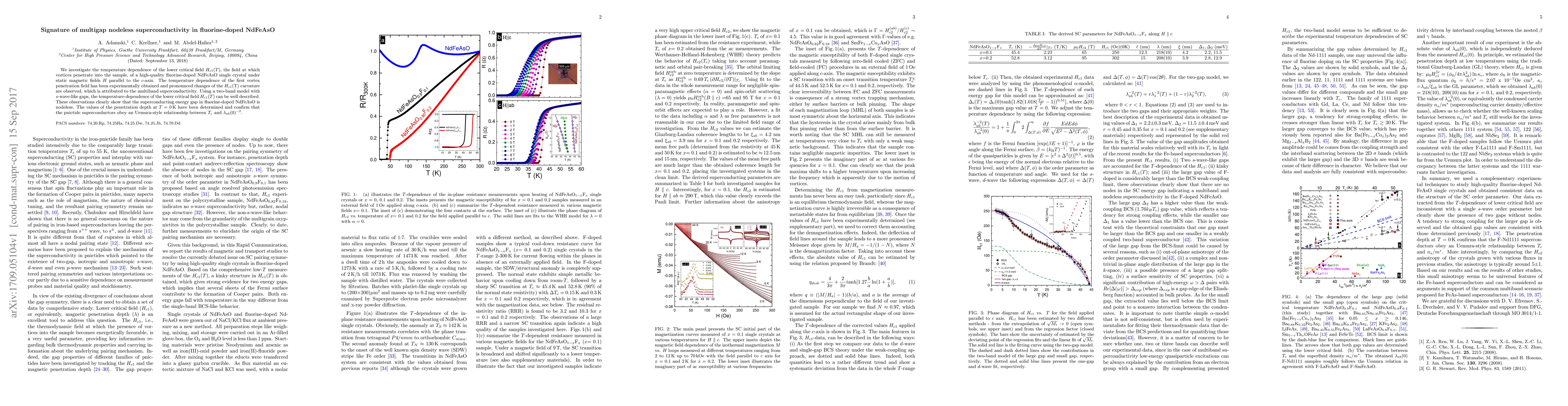 This paper investigates the superconductivity in fluorine-doped NdFeAsO, revealing a multigap nodeless superconducting state through the analysis of the lower critical field $H_{c1}(T)$. The findings support a two-band model with $s$-wave-like gaps and confirm the absence of nodes in the superconducting energy gap.