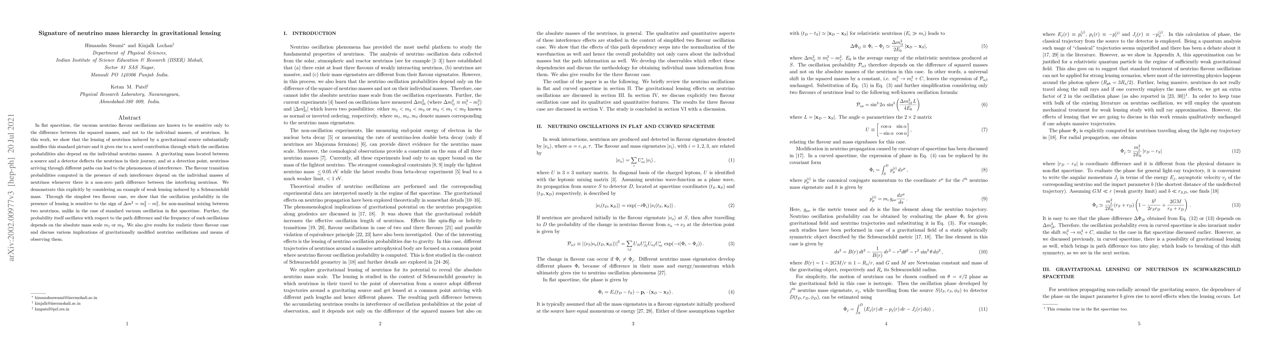 In flat spacetime, the vacuum neutrino flavour oscillations are known to be sensitive only to the difference between the squared masses, and not to the individual masses, of neutrinos. In this work, we show that the lensing of neutrinos induced by a gravitational source substantially modifies this standard picture and it gives rise to a novel contribution through which the oscillation probabilities also depend on the individual neutrino masses. A gravitating mass located between a source and a detector deflects the neutrinos in their journey, and at a detection point, neutrinos arriving through different paths can lead to the phenomenon of interference. The flavour transition probabilities computed in the presence of such interference depend on the individual masses of neutrinos whenever there is a non-zero path difference between the interfering neutrinos. We demonstrate this explicitly by considering an example of weak lensing induced by a Schwarzschild mass. Through the simplest two flavour case, we show that the oscillation probability in the presence of lensing is sensitive to the sign of $\Delta m^2 = m_2^2 -m_1^2$, for non-maximal mixing between two neutrinos, unlike in the case of standard vacuum oscillation in flat spacetime. Further, the probability itself oscillates with respect to the path difference and the frequency of such oscillations depends on the absolute mass scale $m_1$ or $m_2$. We also give results for realistic three flavour case and discuss various implications of gravitationally modified neutrino oscillations and means of observing them.