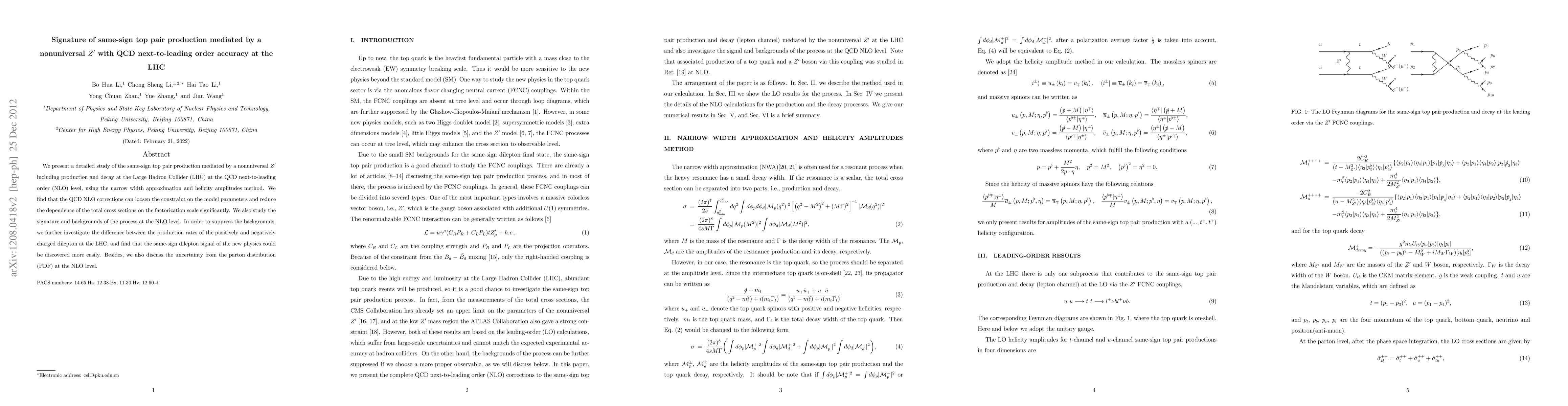 This paper investigates the same-sign top pair production via a non-universal $Z^\prime$ at the LHC, including QCD NLO corrections. It finds that these corrections can weaken model constraints and reduce cross section dependence on the factorization scale, while enhancing the potential for discovering the same-sign dilepton signal.