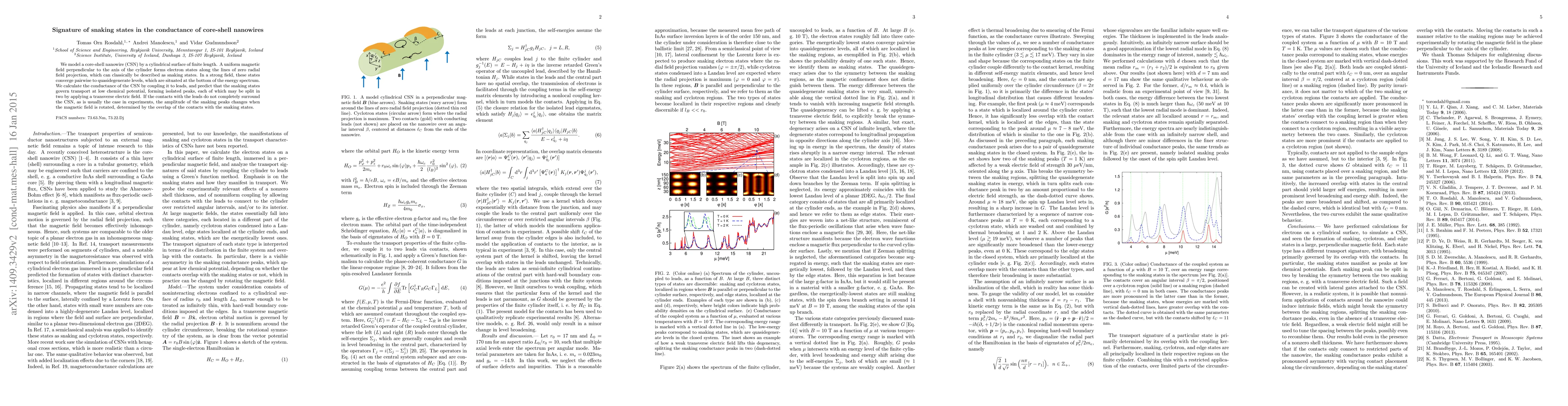 We model a core-shell nanowire (CSN) by a cylindrical surface of finite length. A uniform magnetic field perpendicular to the axis of the cylinder forms electron states along the lines of zero radial field projection, which can classically be described as snaking states. In a strong field, these states converge pairwise to quasidegenerate levels, which are situated at the bottom of the energy spectrum. We calculate the conductance of the CSN by coupling it to leads, and predict that the snaking states govern transport at low chemical potential, forming isolated peaks, each of which may be split in two by applying a transverse electric field. If the contacts with the leads do not completely surround the CSN, as is usually the case in experiments, the amplitude of the snaking peaks changes when the magnetic field is rotated, determined by the overlap of the contacts with the snaking states.