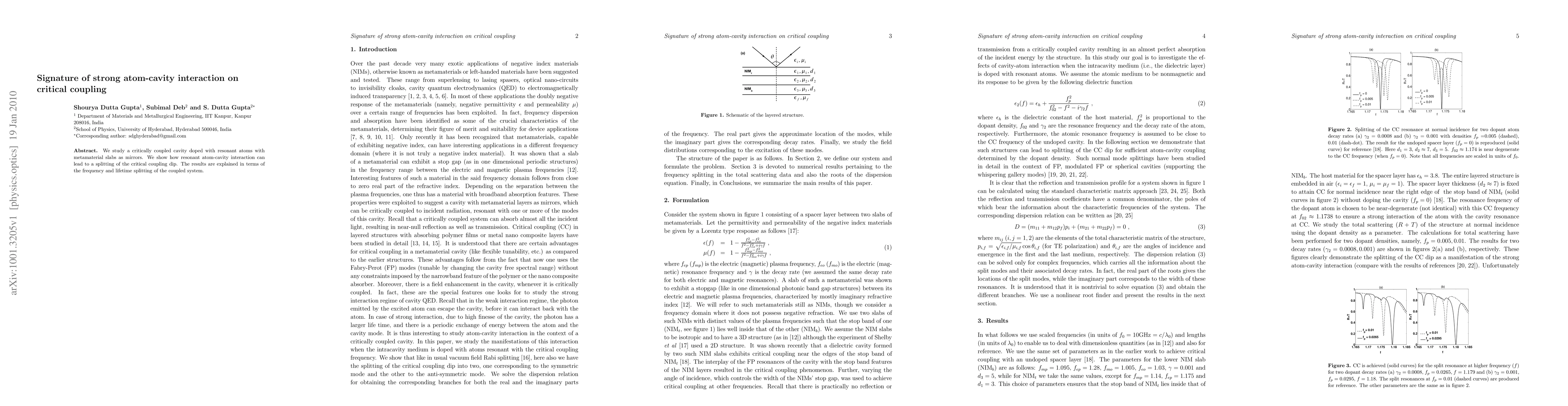 This paper investigates a critically coupled cavity with resonant atoms and metamaterial mirrors, demonstrating that strong atom-cavity interaction can split the critical coupling dip. The findings are attributed to the frequency and lifetime splitting within the coupled atom-cavity system.