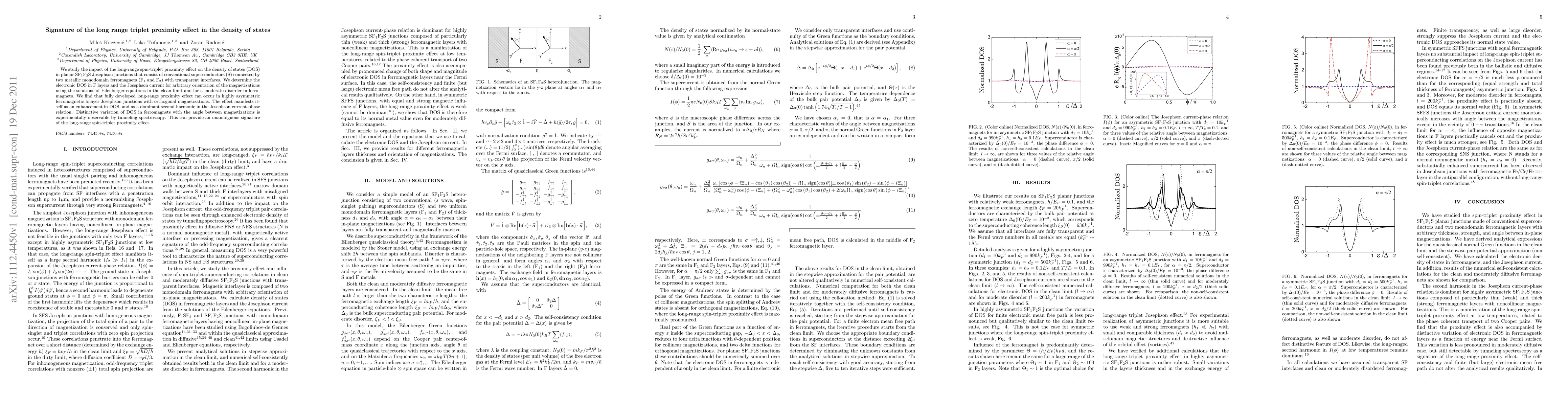 This paper investigates the long-range spin-triplet proximity effect in planar SF1F2S Josephson junctions, revealing an enhancement in the density of states and a dominant second harmonic in the Josephson current, which can be detected via tunneling spectroscopy.