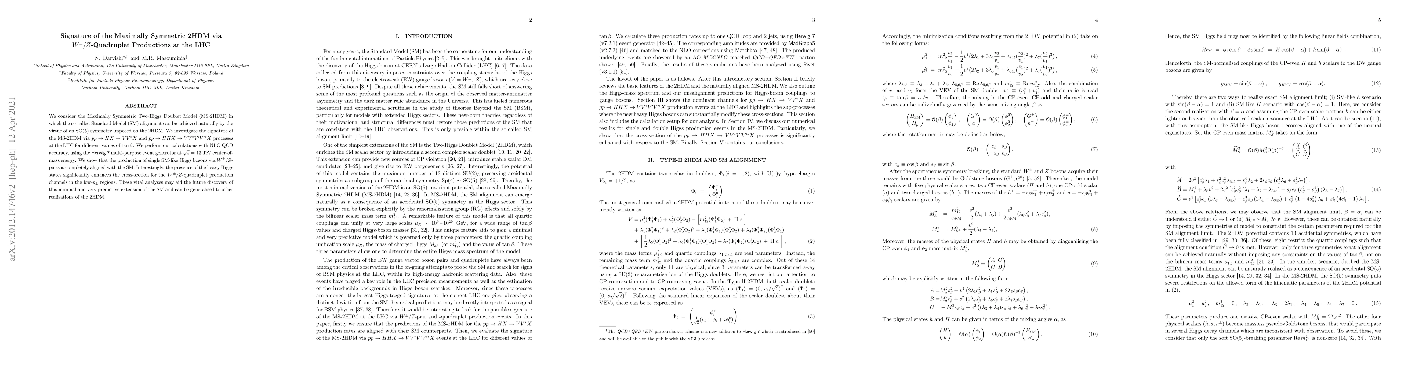This paper investigates the Maximally Symmetric Two-Higgs Doublet Model (MS-2HDM) via $W^{\pm}/Z$-quadruplet production at the LHC, showing that single SM-like Higgs production aligns with the Standard Model while heavy Higgs states enhance $W^{\pm}/Z$-quadruplet cross-sections in low-$p_{\perp}$ regions. These findings could aid in discovering this predictive extension of the SM.