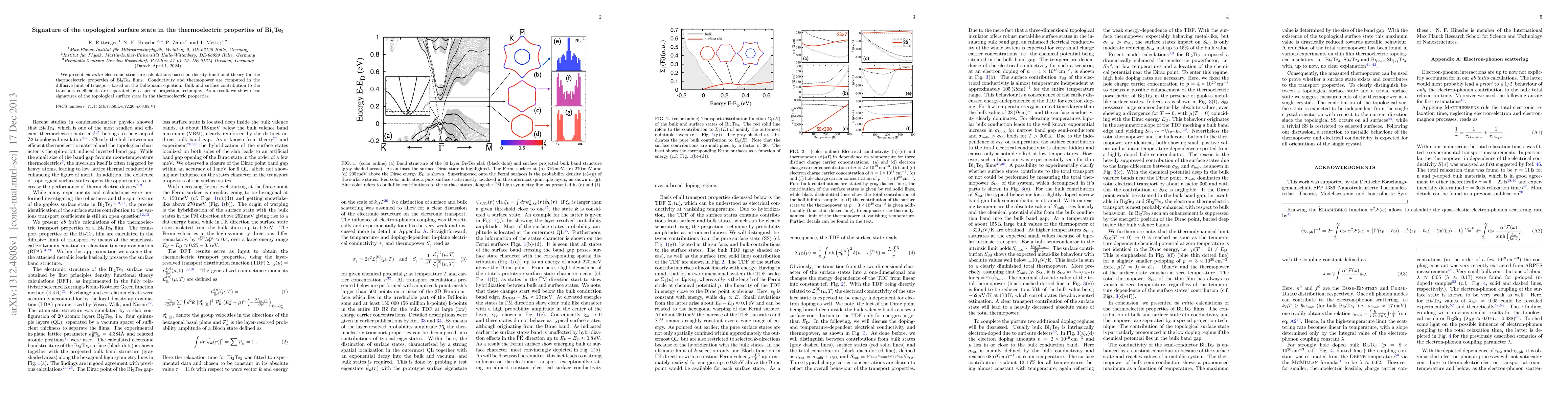 We present ab initio electronic structure calculations based on density functional theory for the thermoelectric properties of Bi$_2$Te$_3$ films. Conductivity and thermopower are computed in the diffusive limit of transport based on the Boltzmann equation. Bulk and surface contribution to the transport coefficients are separated by a special projection technique. As a result we show clear signatures of the topological surface state in the thermoelectric properties.