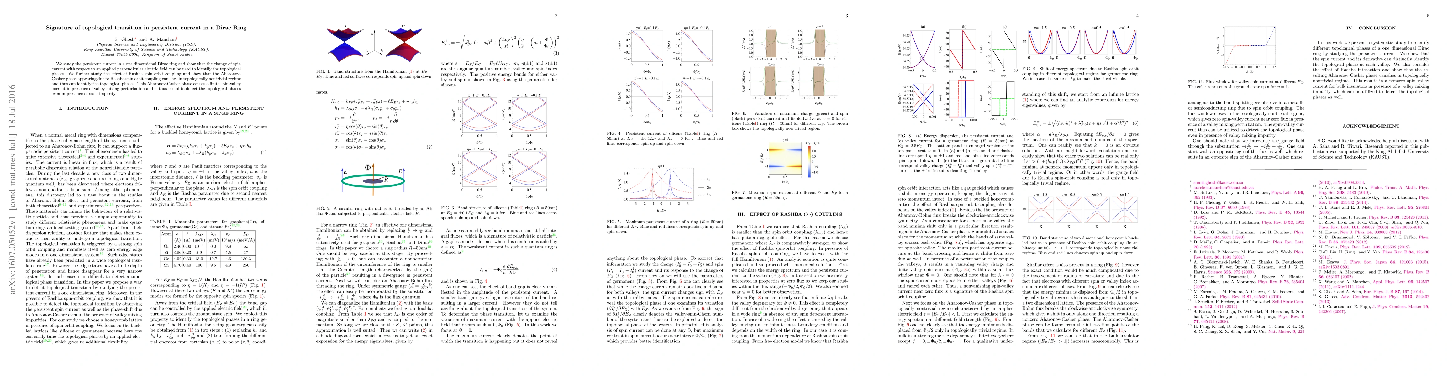 This paper investigates the persistent current in a one-dimensional Dirac ring, demonstrating that changes in spin current with an applied electric field can identify topological phases. It also reveals that the Aharonov-Casher phase due to Rashba spin-orbit coupling vanishes in nontrivial topological regimes, aiding in phase detection even with valley mixing perturbations.