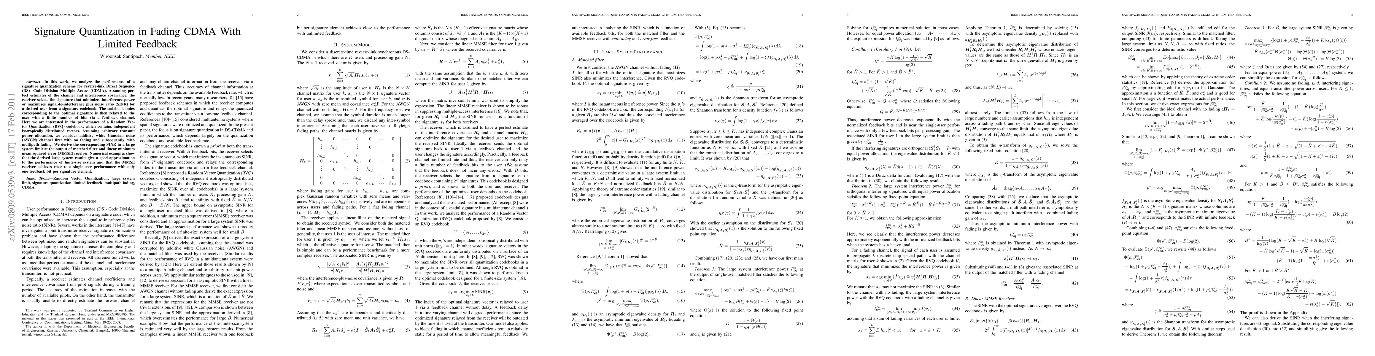 This paper investigates the performance of a signature quantization scheme in fading CDMA systems with limited feedback, focusing on Random Vector Quantization (RVQ) codebooks. It derives the Signal-to-Interference Plus Noise Ratio (SINR) for both AWGN and multipath fading channels, showing that the MMSE receiver achieves near single-user performance with minimal feedback.