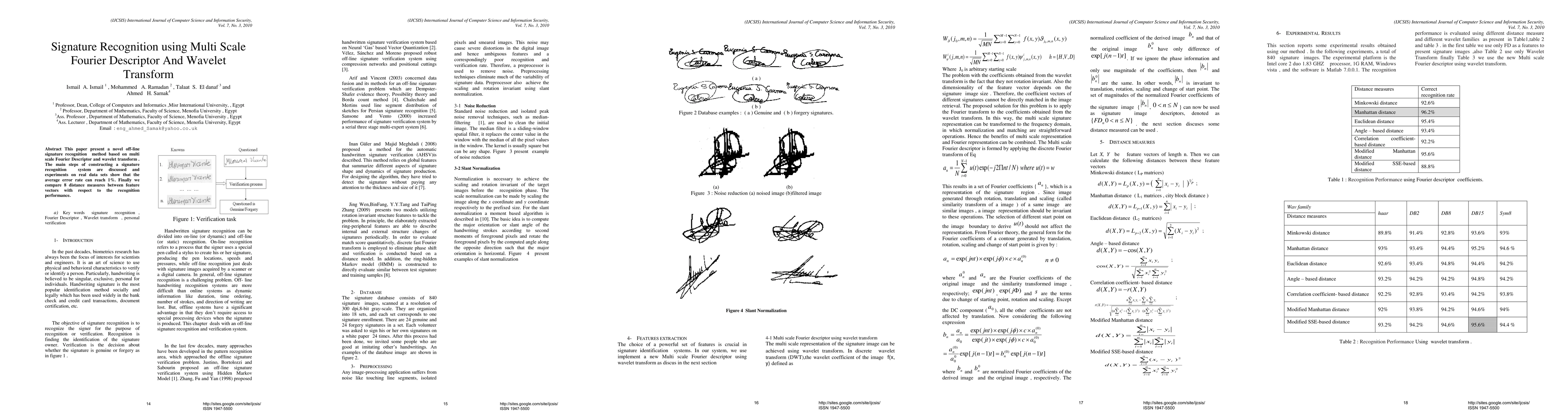This paper present a novel off-line signature recognition method based on multi scale Fourier Descriptor and wavelet transform . The main steps of constructing a signature recognition system are discussed and experiments on real data sets show that the average error rate can reach 1%. Finally we compare 8 distance measures between feature vectors with respect to the recognition performance. Key words: signature recognition; Fourier Descriptor; Wavelet transform; personal verification