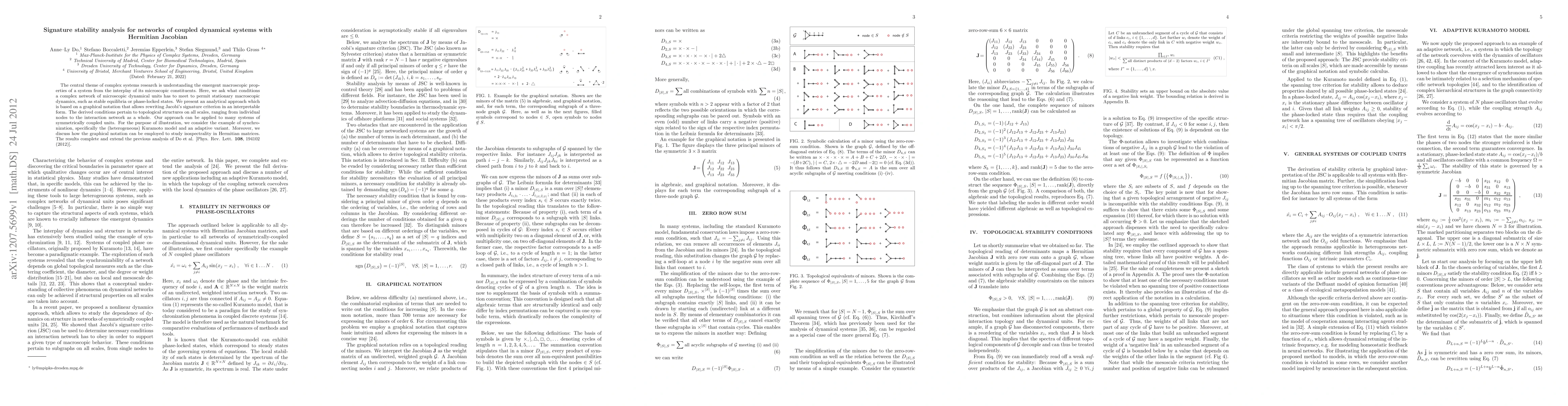 The central theme of complex systems research is understanding the emergent macroscopic properties of a system from the interplay of its microscopic constituents. Here, we ask what conditions a complex network of microscopic dynamical units has to meet to permit stationary macroscopic dynamics, such as stable equilibria or phase-locked states. We present an analytical approach which is based on a graphical notation that allows rewriting Jacobi's signature criterion in an interpretable form. The derived conditions pertain to topological structures on all scales, ranging from individual nodes to the interaction network as a whole. Our approach can be applied to many systems of symmetrically coupled units. For the purpose of illustration, we consider the example of synchronization, specifically the (heterogeneous) Kuramoto model and an adaptive variant. Moreover, we discuss how the graphical notation can be employed to study isospectrality in Hermitian matrices. The results complete and extend the previous analysis of Do et al. [Phys. Rev. Lett. 108, 194102 (2012)].