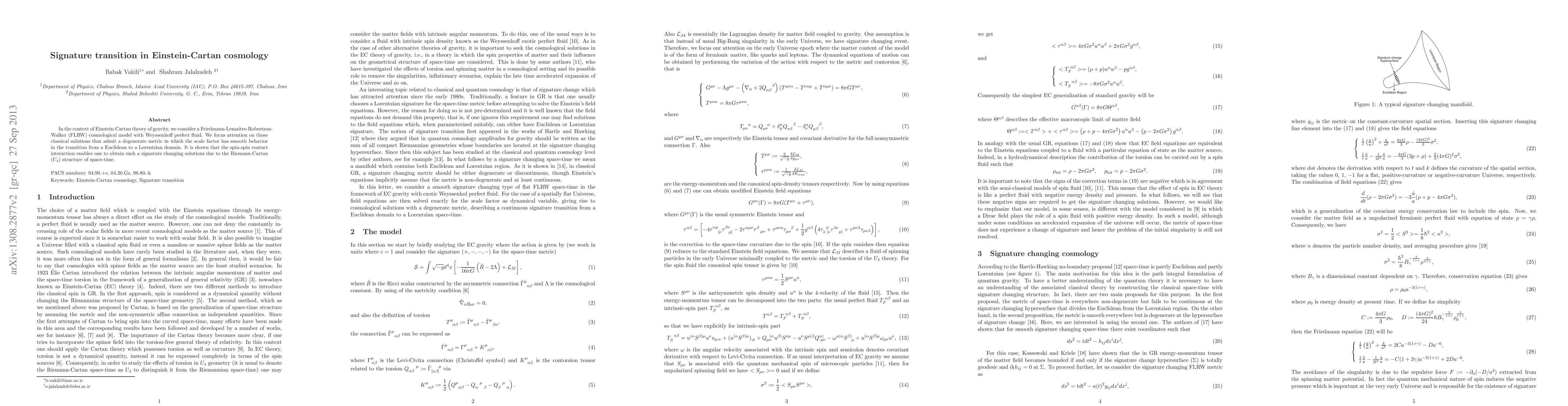 The paper presents modified Einstein field equations in Einstein-Cartan theory, incorporating torsion-induced corrections due to spin, and derives exact solutions for signature-changing FLRW metrics in various cosmological scenarios.