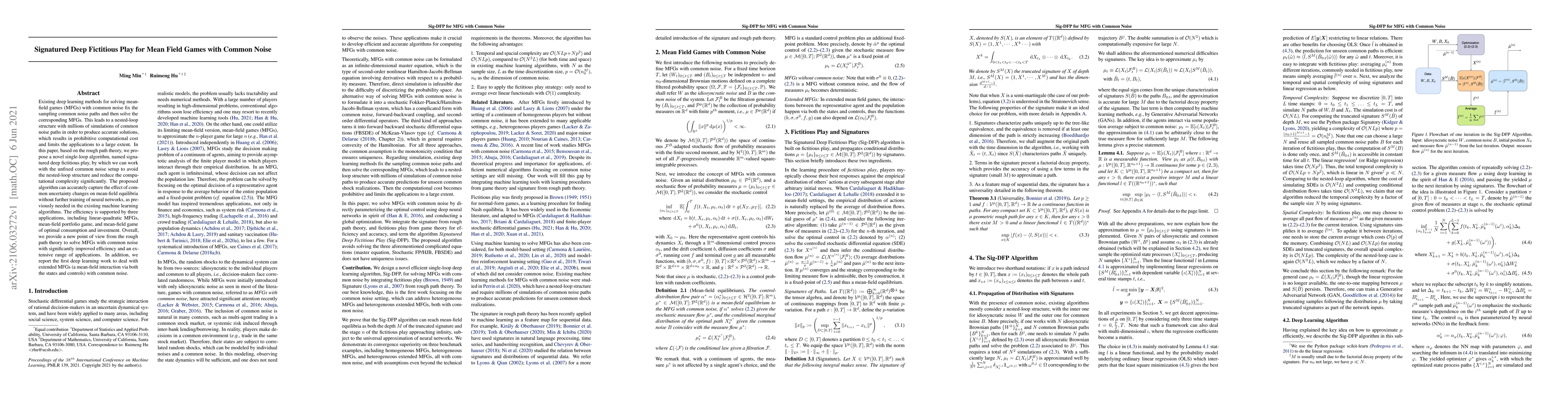 This paper introduces a signatured deep fictitious play algorithm based on rough path theory to solve mean-field games with common noise, eliminating the nested-loop structure and significantly reducing computational complexity. The proposed method efficiently captures the impact of common uncertainty changes without additional neural network training.